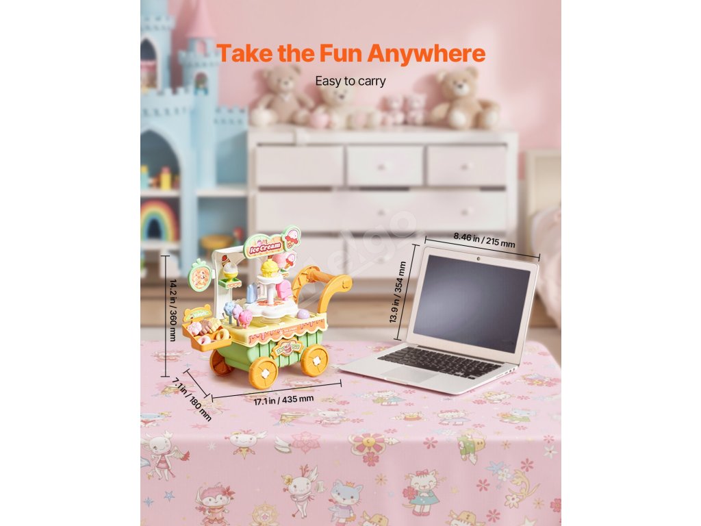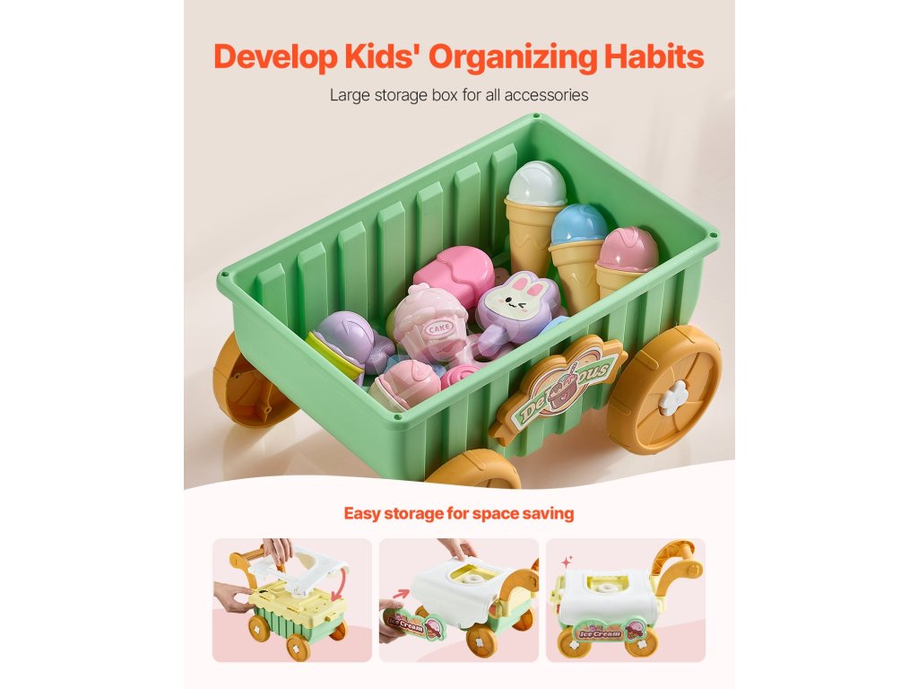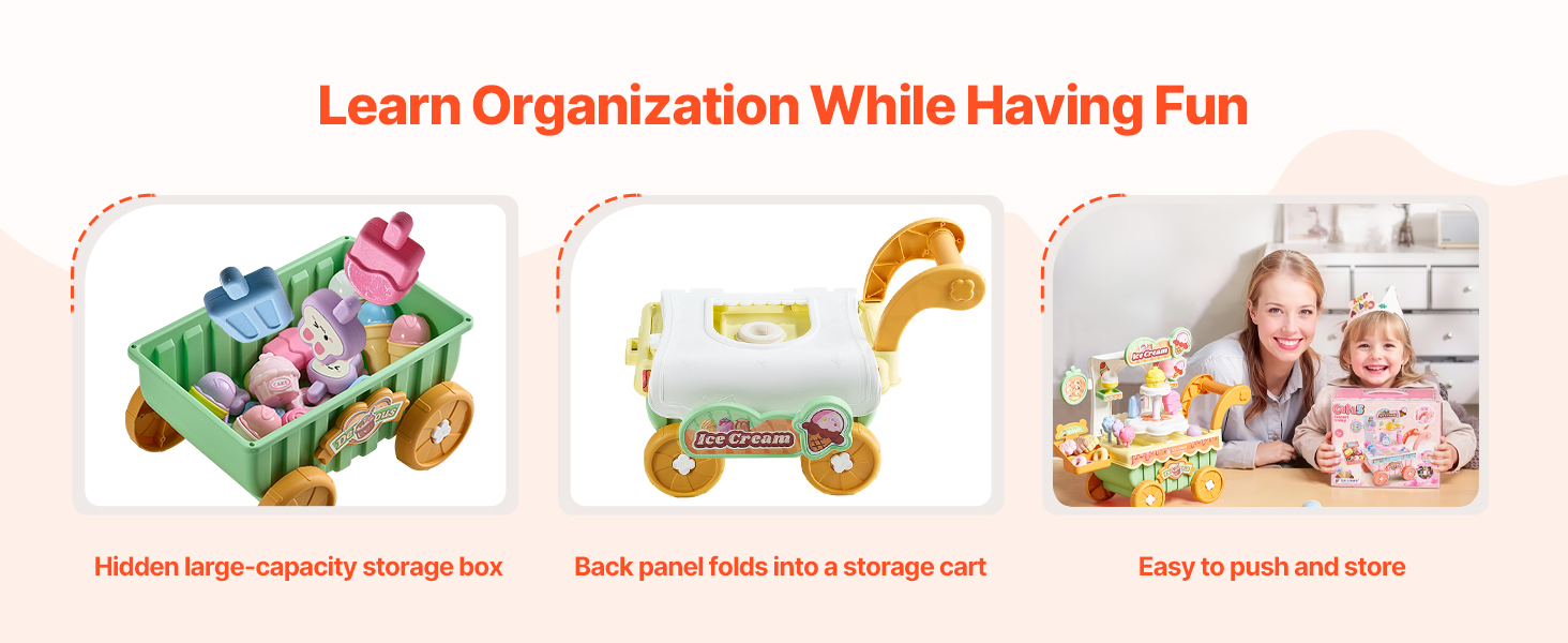 Už žiadny neporiadok s hračkami! Hračka zmrzlinového obchodu slúži ako úložný box a udržiava všetko v poriadku. Vďaka rukoväti sa ľahko tlačí a zadný panel sa zloží do úložného vozíka pre upratané hranie.