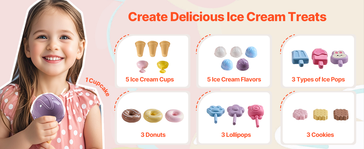 Náš zmrzlinársky vozík má 27 zábavných častí - kornútky, naberačky, nanuky a ďalšie! Deti môžu miešať, spájať a vytvárať snové zmrzlinové kombinácie, čím svoje chutné nápady uvedú do života s nekonečnou kreativitou.