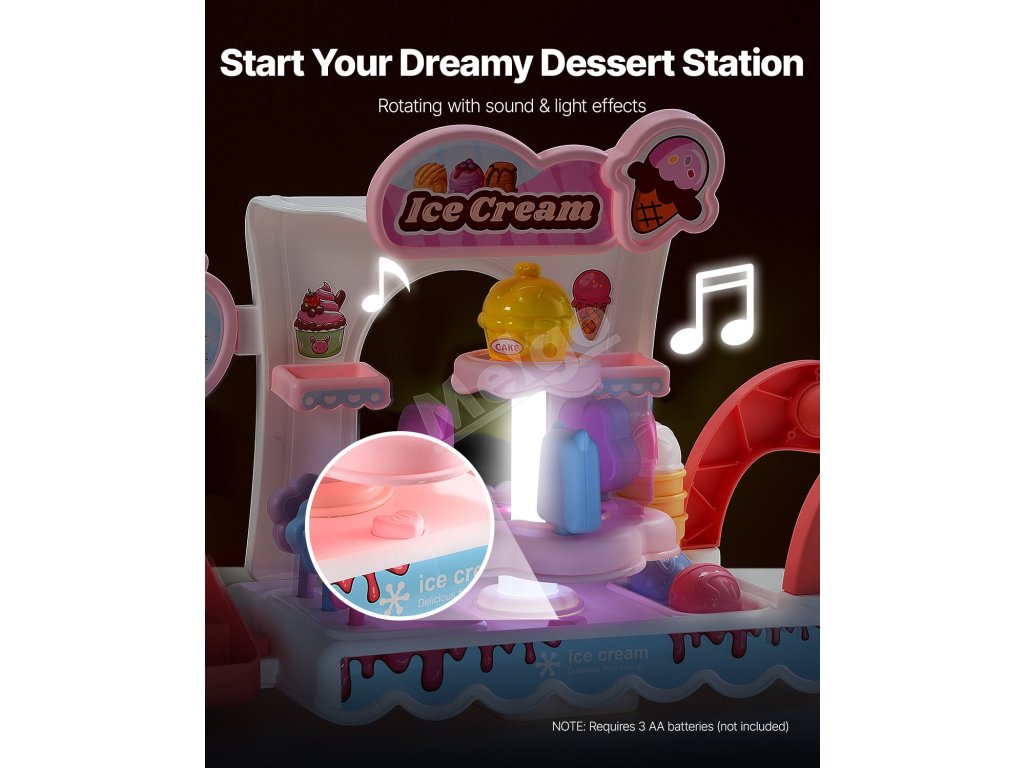 Viac ako len zmrzlinový vozík! Deti sa môžu hrať na predavača, vytvárať nové príchute alebo podávať dobroty. Vďaka otáčajúcemu sa, svietiacemu stojanu na zákusky s hudbou je každá hra mimoriadne zábavná!