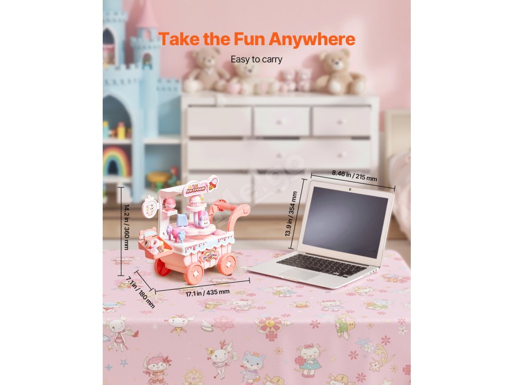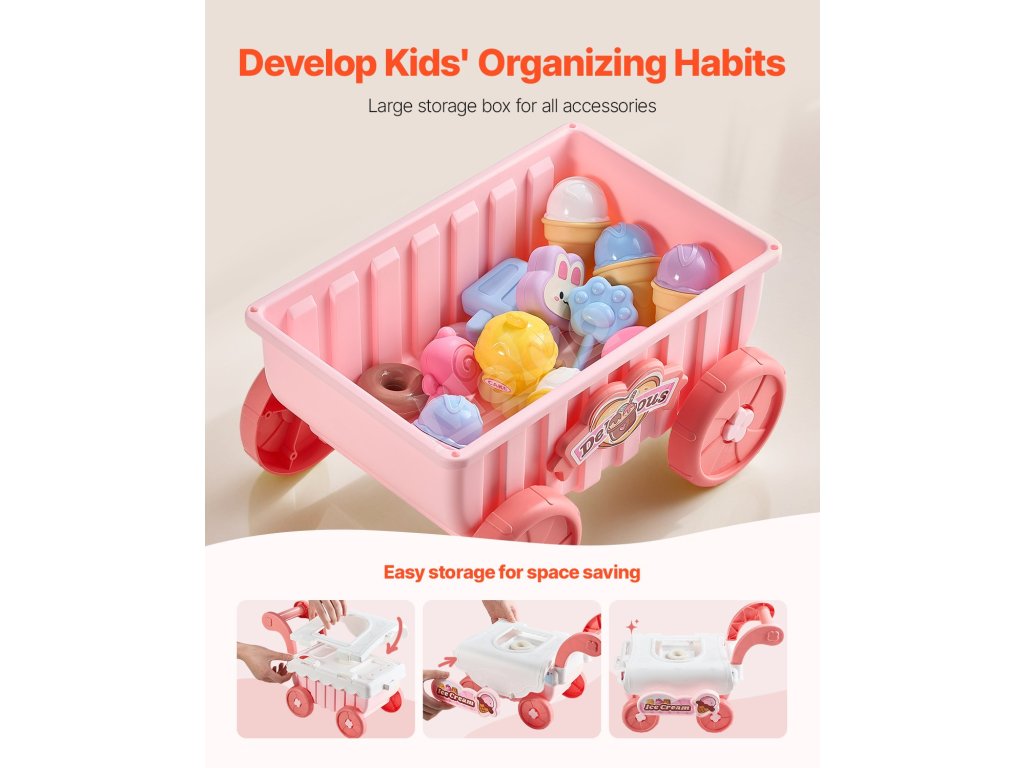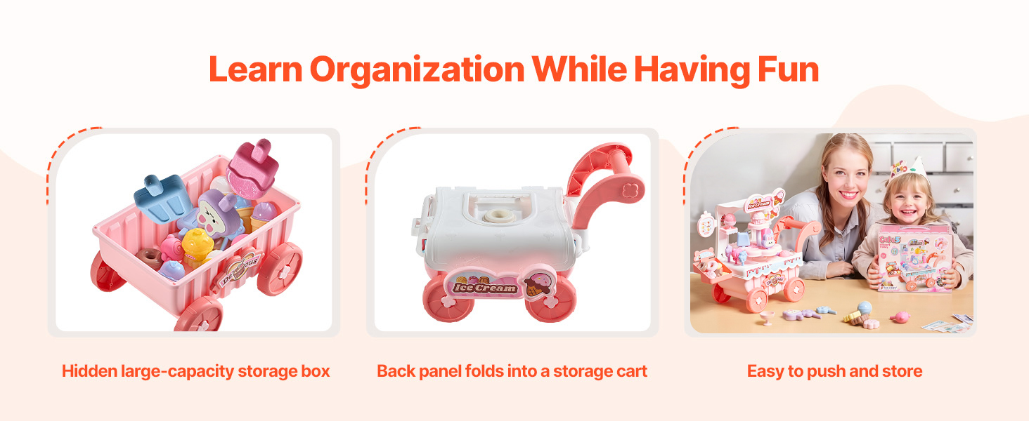 Už žiadny neporiadok s hračkami! Hračka zmrzlinového obchodu slúži ako úložný box a udržiava všetko v poriadku. Vďaka rukoväti sa ľahko tlačí a zadný panel sa zloží do úložného vozíka pre upratané hranie.