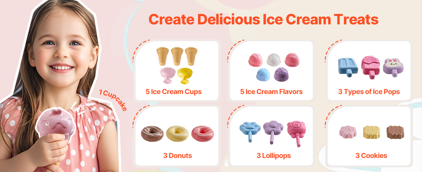 Náš zmrzlinársky vozík má 27 zábavných častí - kornútky, naberačky, nanuky a ďalšie! Deti môžu miešať, spájať a vytvárať snové zmrzlinové kombinácie, čím svoje chutné nápady uvedú do života s nekonečnou kreativitou.