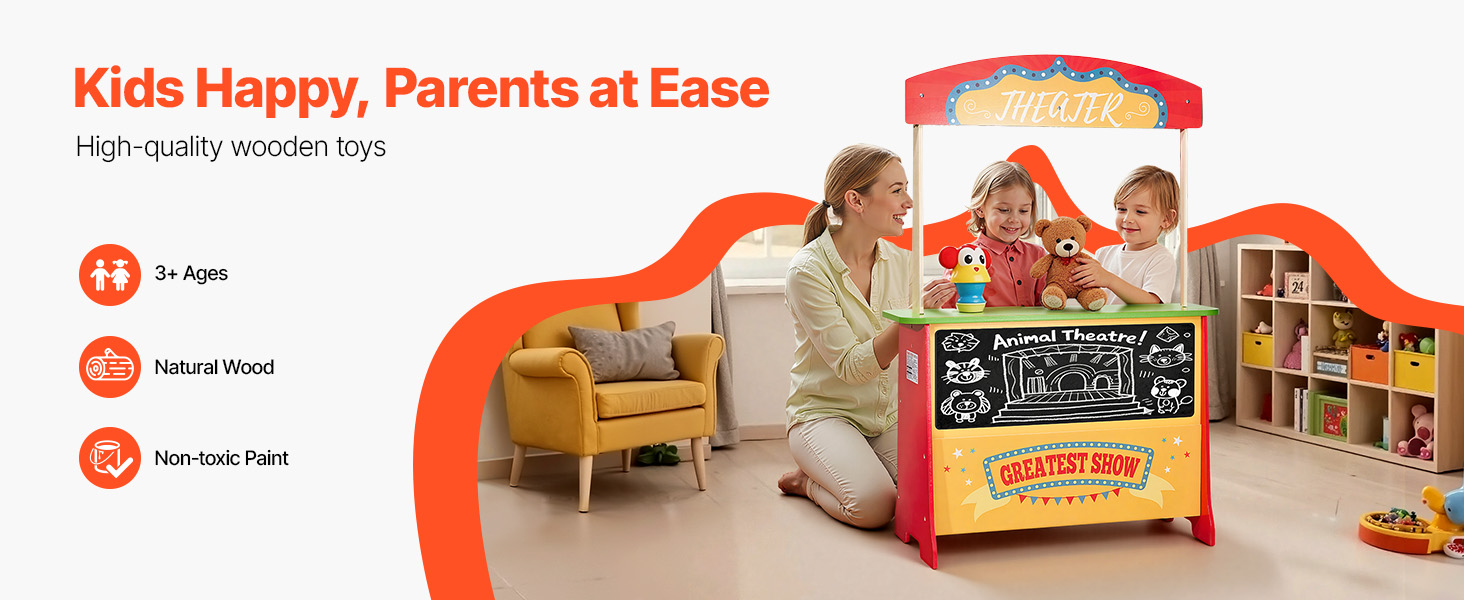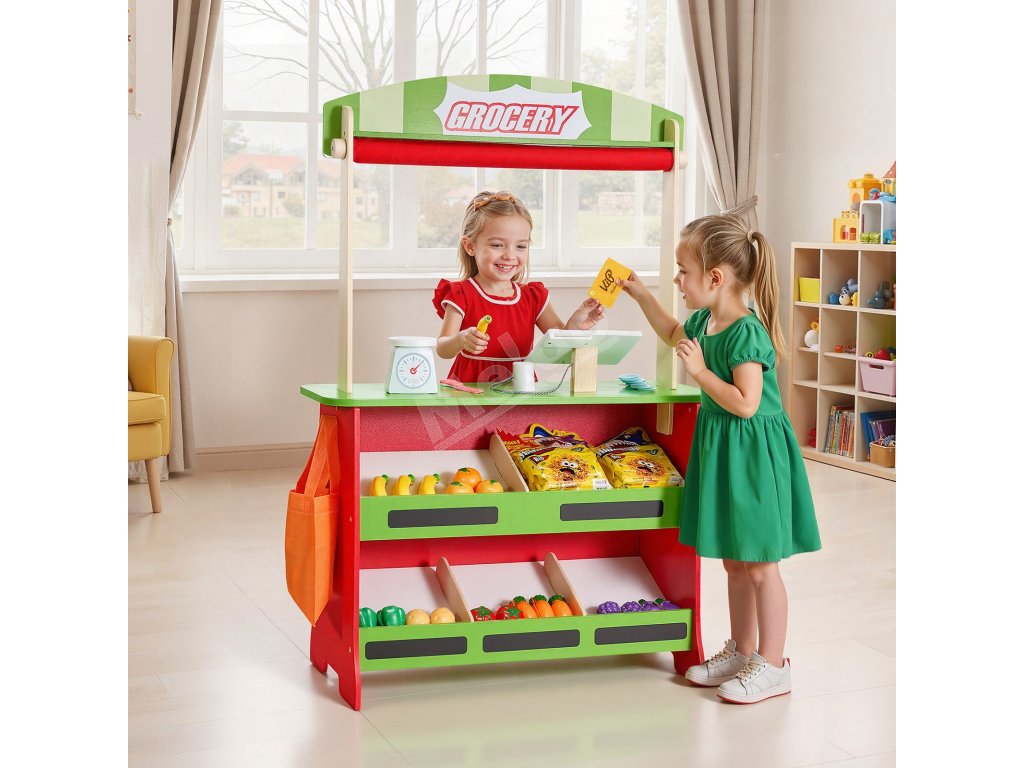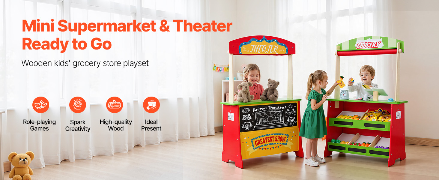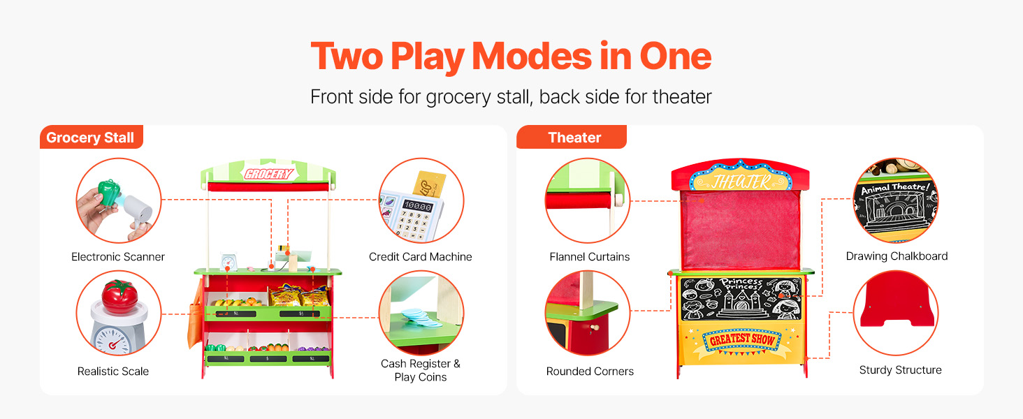 Táto drevená detská hracia súprava umožňuje vášmu dieťaťu užívať si minitrh aj malé divadlo! Vďaka zábavným multifunkčným interakciám, realistickým doplnkom a robustnej drevenej konštrukcii si deti užijú nekonečnú zábavu počas hry!