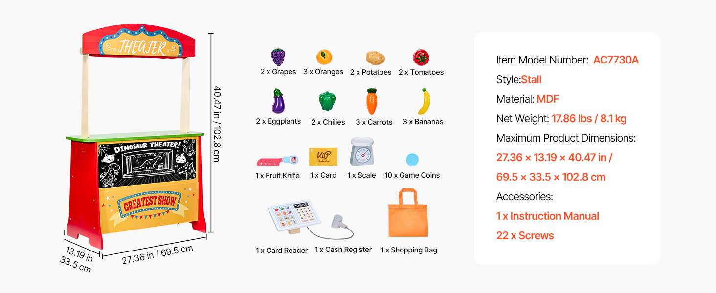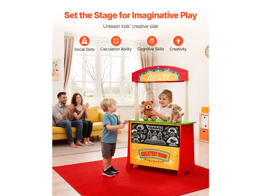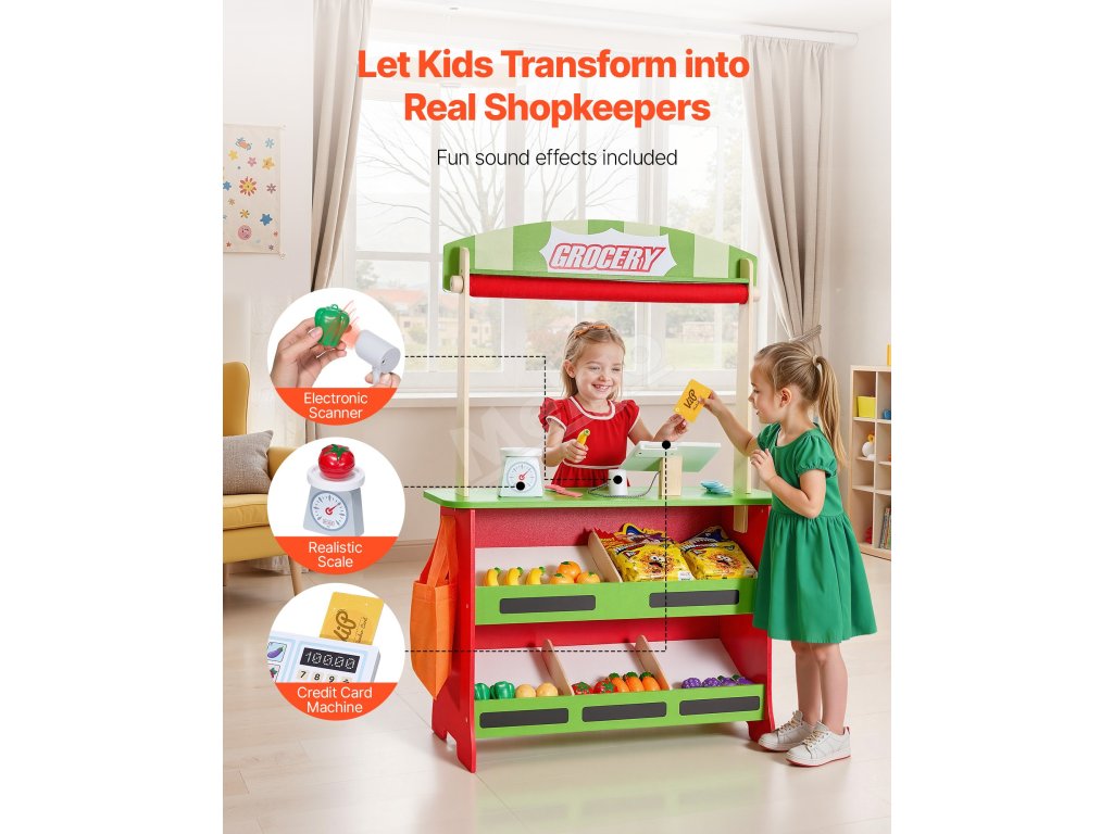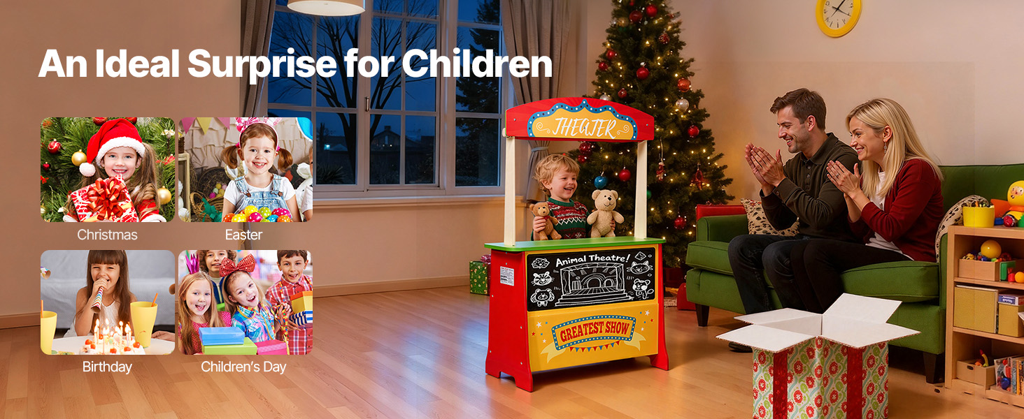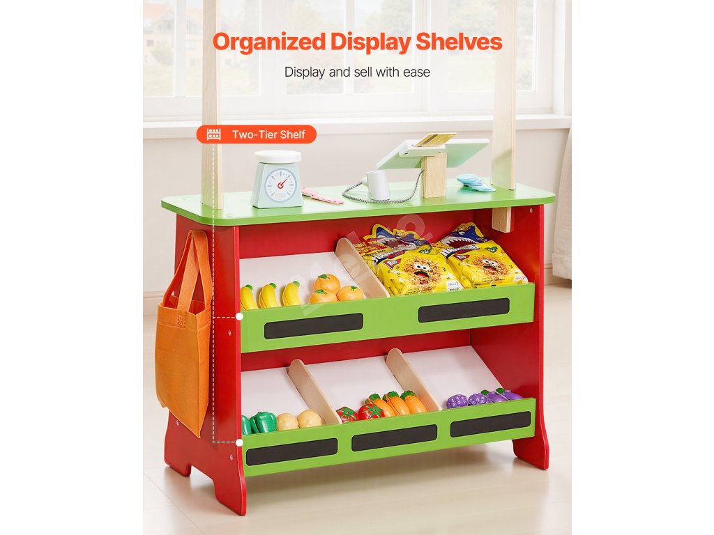 Táto drevená detská hracia súprava umožňuje vášmu dieťaťu užívať si minitrh aj malé divadlo! Vďaka zábavným multifunkčným interakciám, realistickým doplnkom a robustnej drevenej konštrukcii si deti užijú nekonečnú zábavu počas hry!