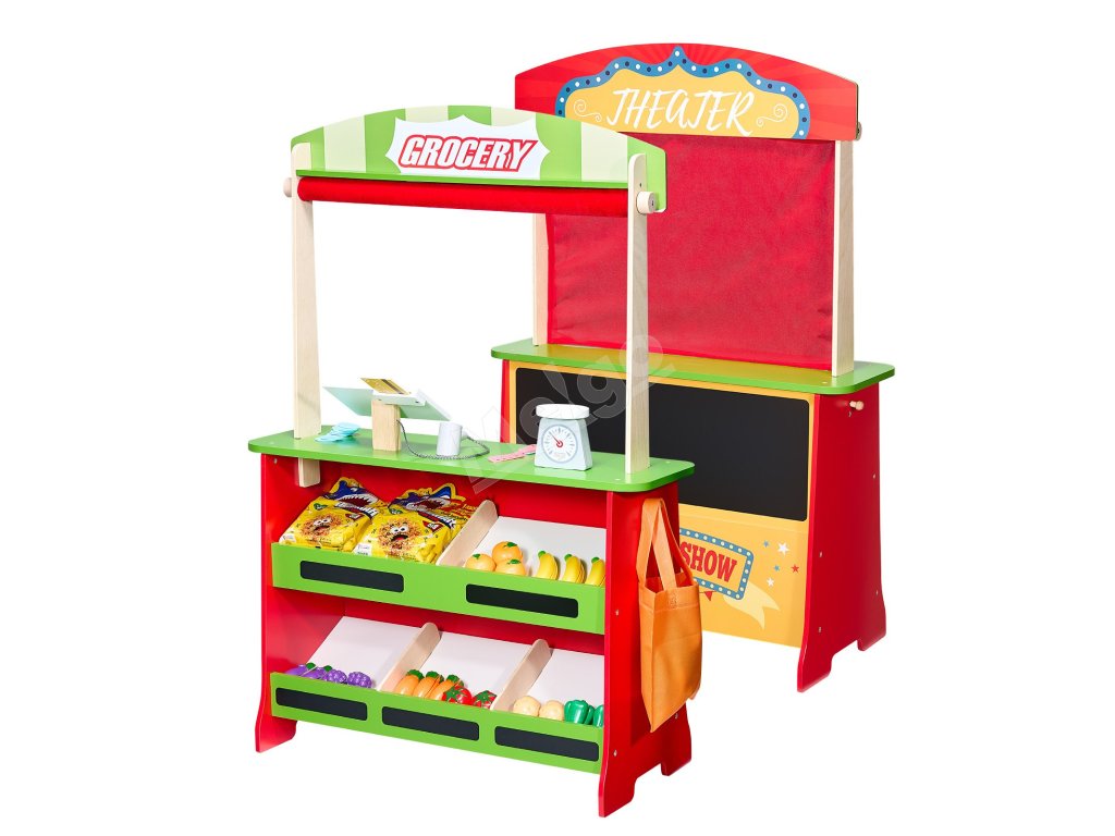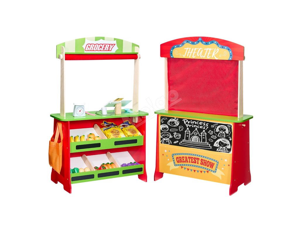 Drevené bábkové divadlo 2v1 s oponou, dvojstranný obchod, pokladňa