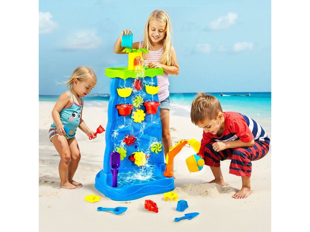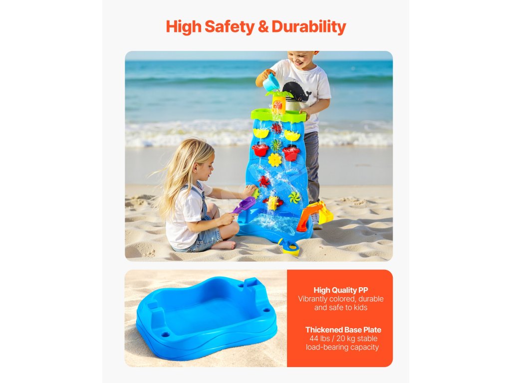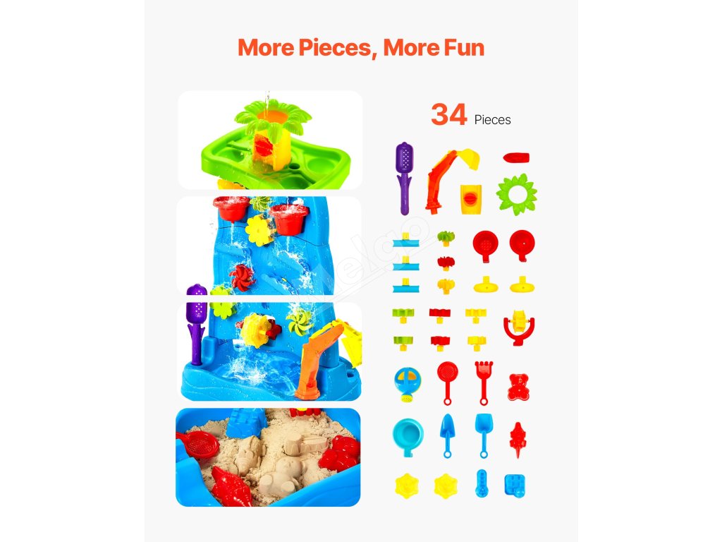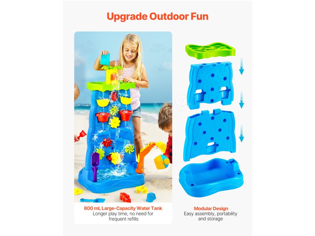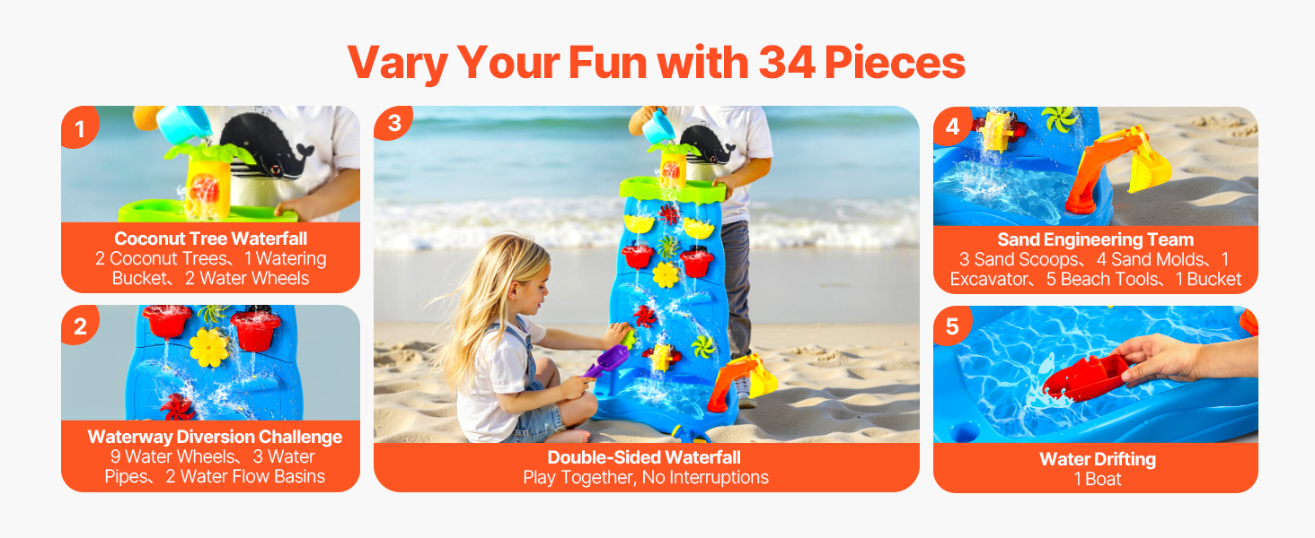 Vďaka viacerým doplnkom, ako sú vodné veterné mlyny, kokosové palmy, plážové náradie, vodné kolesá, bagr, loď a ďalšie, môžu deti s hracím stolíkom VEVOR vodopád a svojou bohatou fantáziou vytvárať radostné vzrušujúce herné scény.