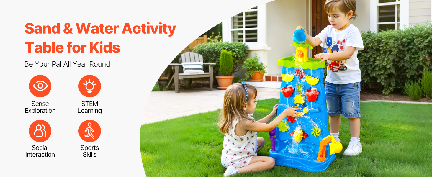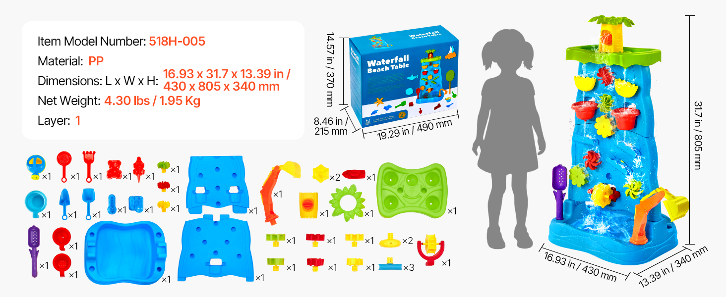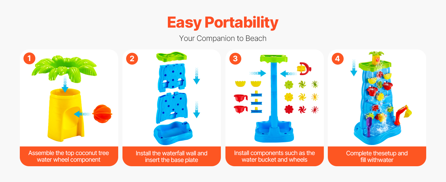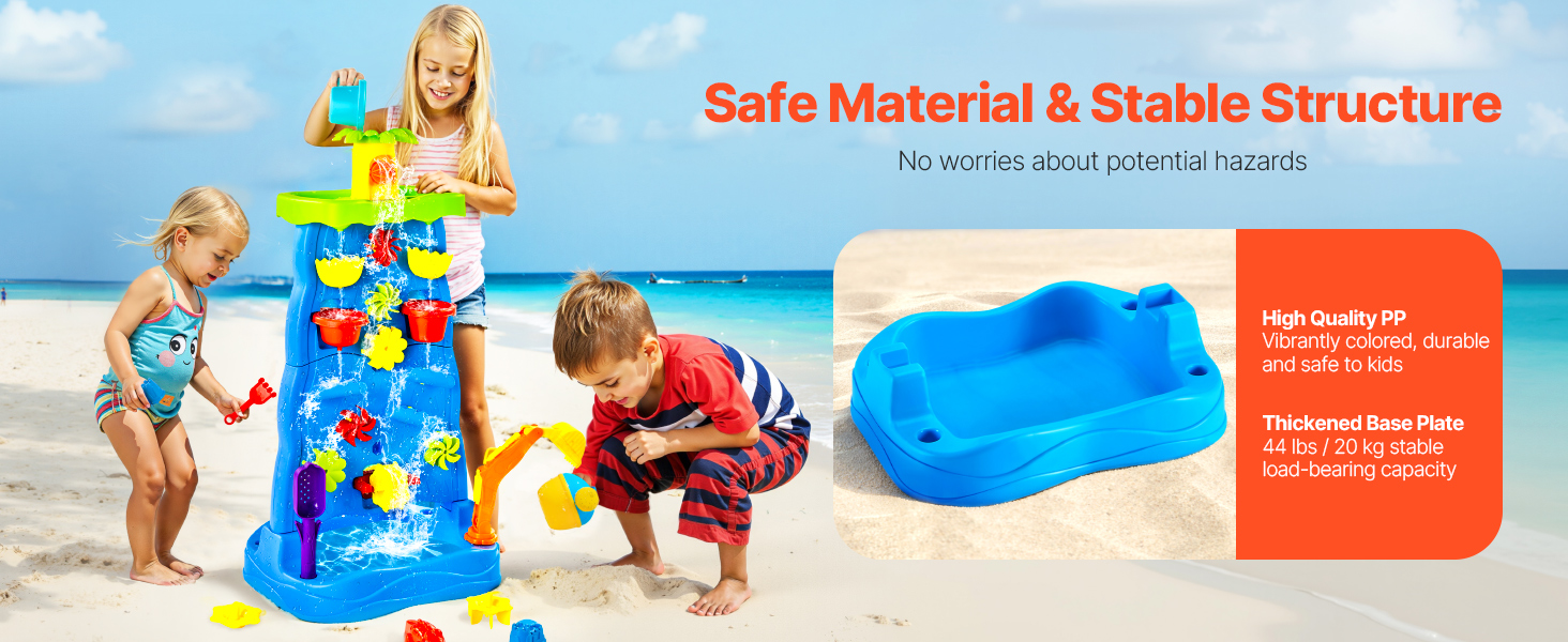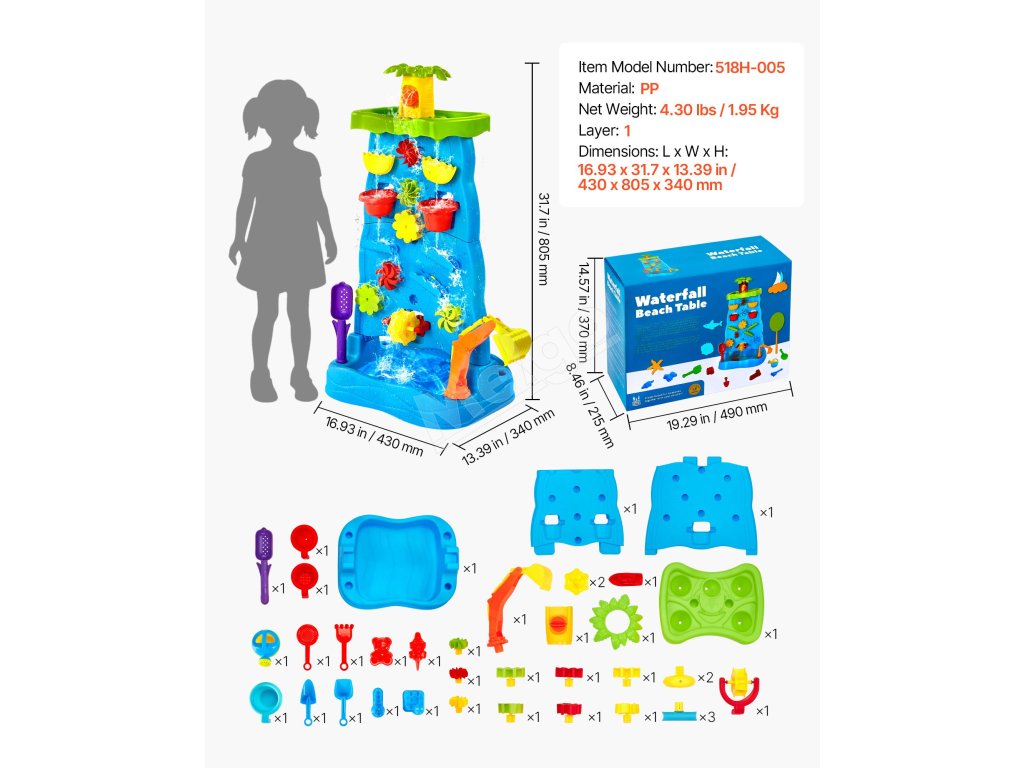Vďaka viacerým doplnkom, ako sú vodné veterné mlyny, kokosové palmy, plážové náradie, vodné kolesá, bagr, loď a ďalšie, môžu deti s hracím stolíkom VEVOR vodopád a svojou bohatou fantáziou vytvárať radostné vzrušujúce herné scény.