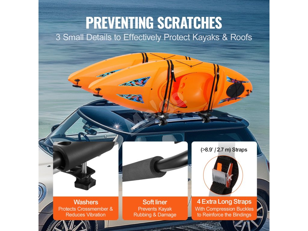 Držiak na kajak má nielen špeciálne miesto na zabránenie poškriabaniu od nárazu kajaku, ale aj viacero mäkkých hrubých podložiek a podložiek na zníženie trenia a vibrácií.