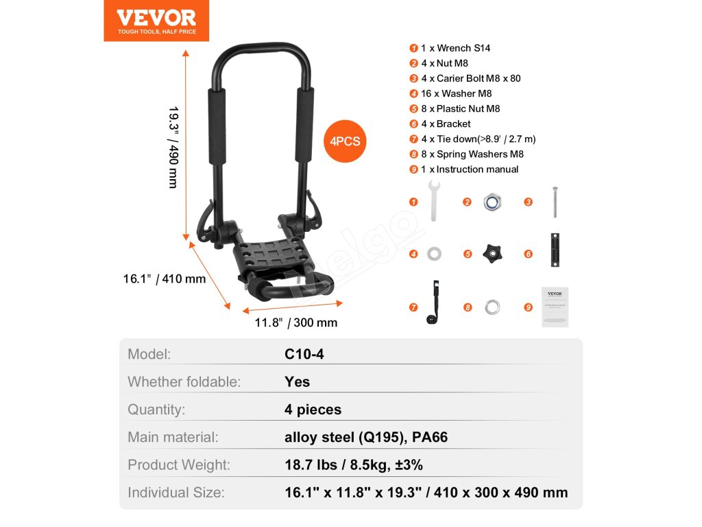 Táto sada strešných nosičov na kajaky má špeciálnu jednostrannú konštrukciu v tvare písmena J a 4 nosiče pohodlne pojmú 2 kajaky.