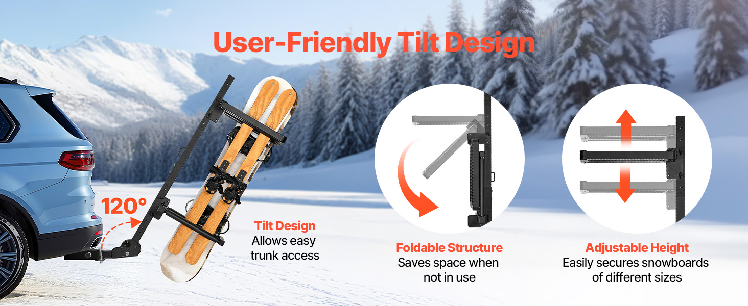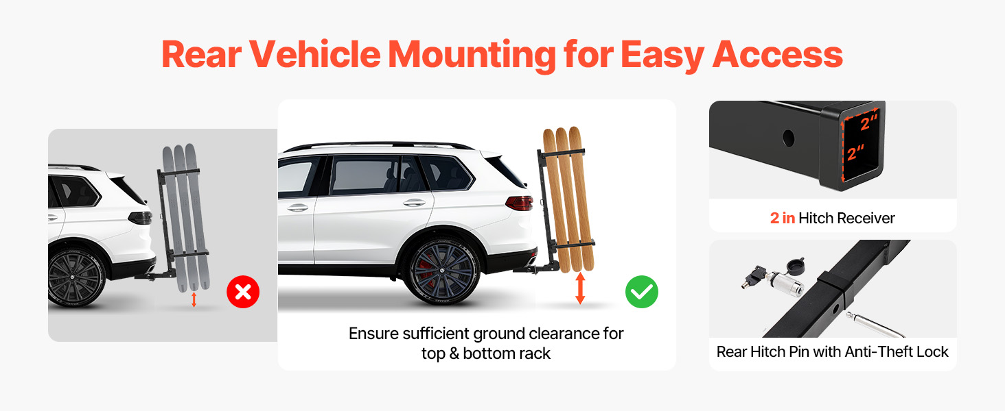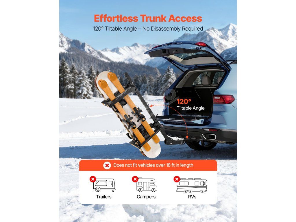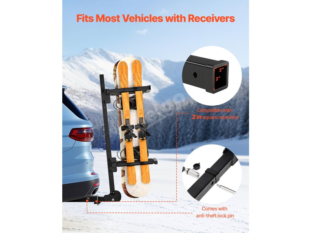 Na rozdiel od strešných nosičov tento nosič lyží na závesné zariadenie umožňuje nakladať a vykladať lyže bez toho, aby ste museli liezť na strechu vozidla. Je navrhnutý tak, aby sa hodil na väčšinu vozidiel s 2-palcovým prijímačom závesu, a zaručuje pohodlné používanie so správnou svetlou výškou na hornom a dolnom držiaku.