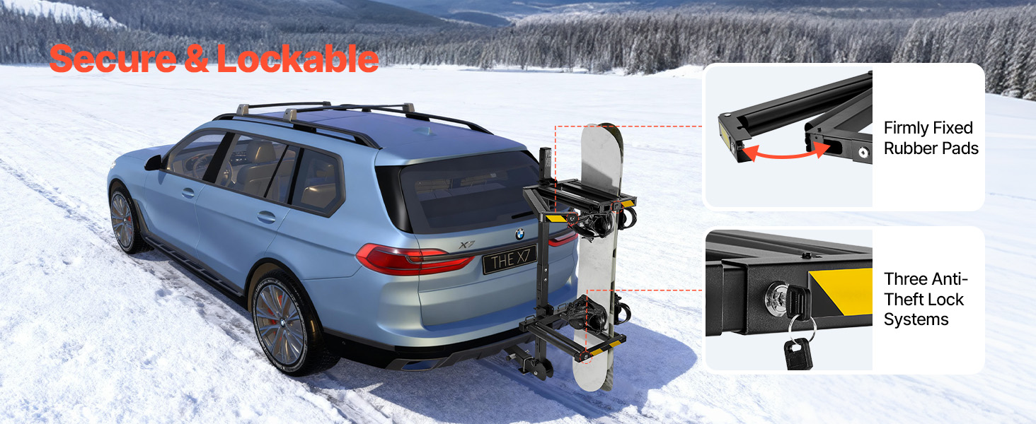 Vďaka zabudovanému zámku proti krádeži je tento nosič lyží a snowboardov odolný proti krádeži alebo náhodnému otvoreniu počas používania v exteriéri a rýchlo zabezpečí vaše lyže. Mäkké, hrubé gumové podložky pevne držia lyže na mieste bez poškriabania alebo poškodenia vášho vybavenia.