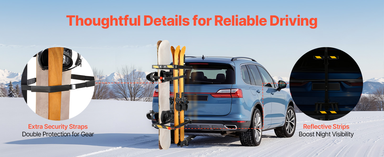 Náš uzamykateľný nosič lyží a snowboardov obsahuje reflexné pásy na zlepšenie viditeľnosti v tme, zatiaľ čo dodatočné bezpečnostné popruhy udržia vaše lyže stabilné a bezpečné počas prepravy. Vďaka týmto premysleným detailom si môžete užívať zimné outdoorové aktivity s väčším pokojom.
