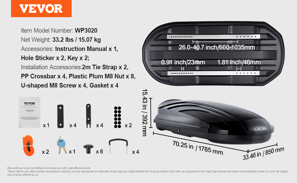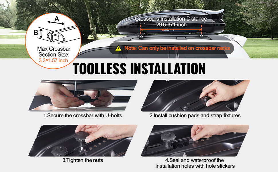 Možno inštalovať len na priečniky; odporúčame vybrať si strešný nákladný box, ktorý zodpovedá modelu vášho vozidla. Uistite sa, že vzdialenosť medzi priečnikmi zodpovedá nákladnému boxu, aby ste zabránili nevyváženosti a zabezpečili rovnomerné rozloženie hmotnosti.