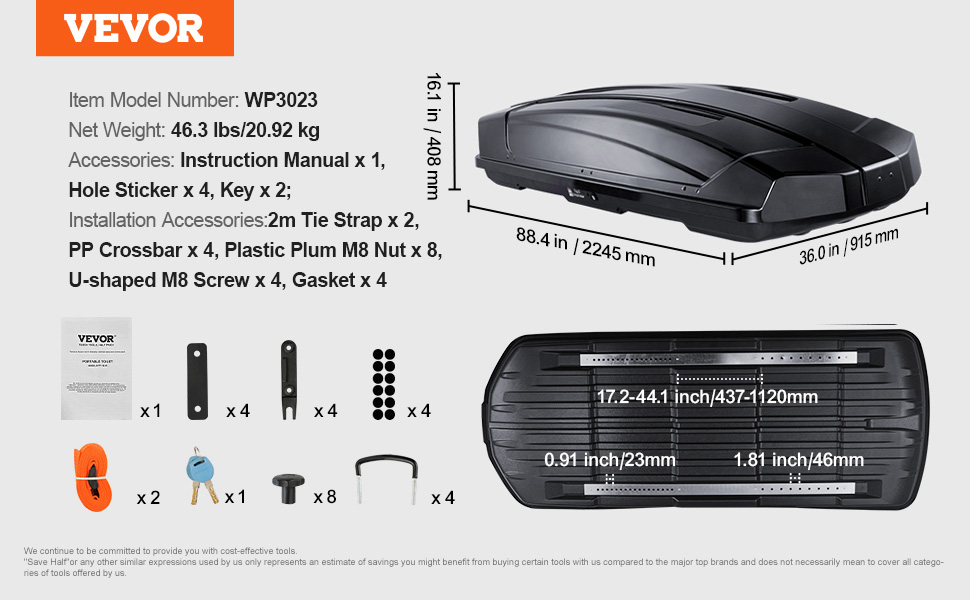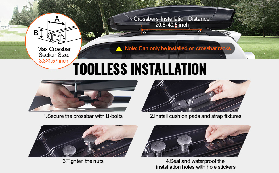 Možno inštalovať len na priečniky; odporúčame vybrať si strešný nákladný box, ktorý zodpovedá modelu vášho vozidla. Uistite sa, že vzdialenosť medzi priečnikmi zodpovedá nákladnému boxu, aby ste zabránili nevyváženosti a zabezpečili rovnomerné rozloženie hmotnosti.