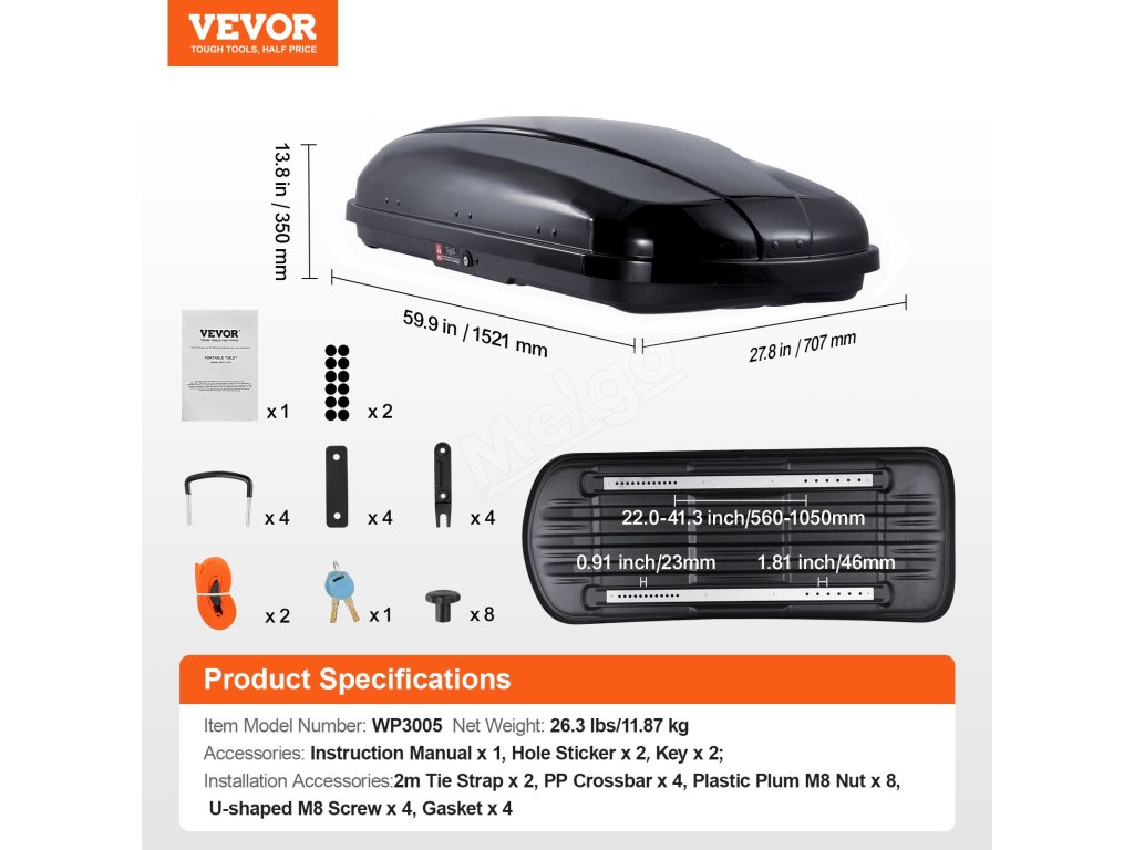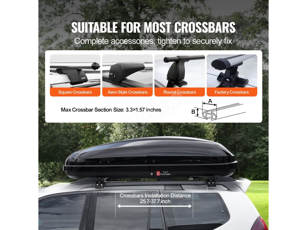 Možno inštalovať len na priečniky; odporúčame vybrať si strešný nákladný box, ktorý zodpovedá modelu vášho vozidla. Uistite sa, že vzdialenosť medzi priečnikmi zodpovedá nákladnému boxu, aby ste zabránili nevyváženosti a zabezpečili rovnomerné rozloženie hmotnosti.