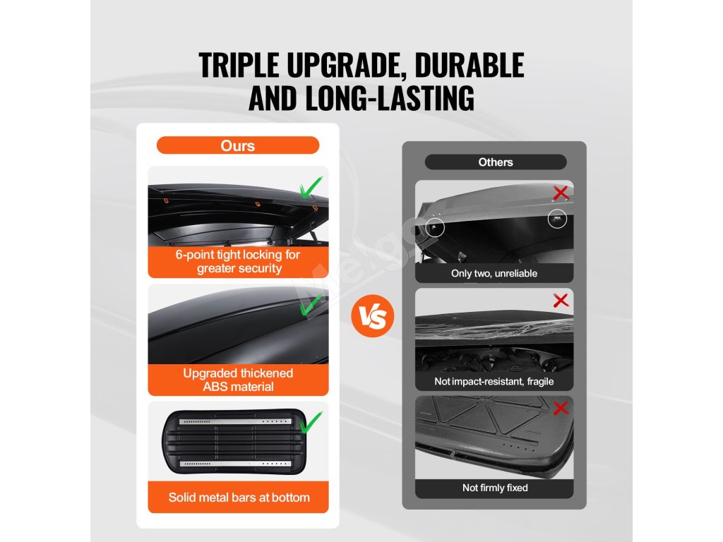 Náš strešný nákladný box je vyrobený prevažne z hrubého materiálu ABS, trvanlivého a odolného voči rozbitiu, účinne vodotesného a odolného voči teplu, ktorý chráni vaše cennosti pred poveternostnými vplyvmi.