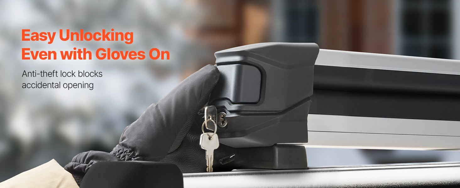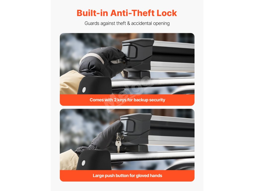 Náš nosič lyží je vybavený zámkom proti krádeži, ktorý sa dá ľahko zaistiť alebo uvoľniť aj v rukaviciach. Tento premyslený dizajn vám umožňuje rýchlu a efektívnu obsluhu počas výletov do prírody bez toho, aby ste si museli vyzliekať rukavice.