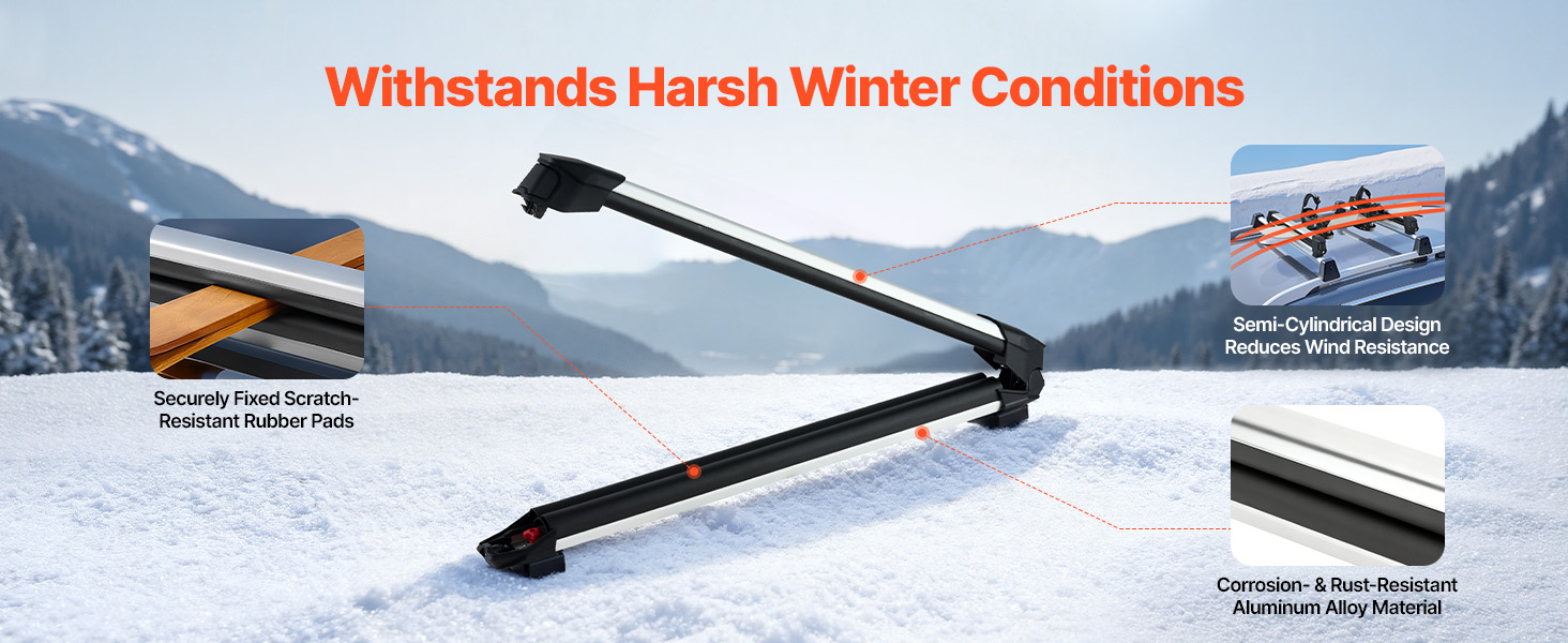 Tento nosič na snowboardy je vyrobený z antikoróznej a odolnej proti hrdzi zliatiny hliníka a odoláva náročným zimným podmienkam. Pevné gumové podložky odolné proti poškriabaniu pevne držia lyže, odolávajú poškodeniu počas prepravy a zabezpečujú bezpečnú a pohodlnú cestu.