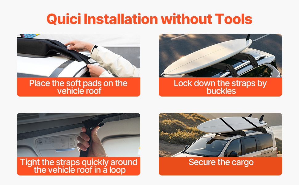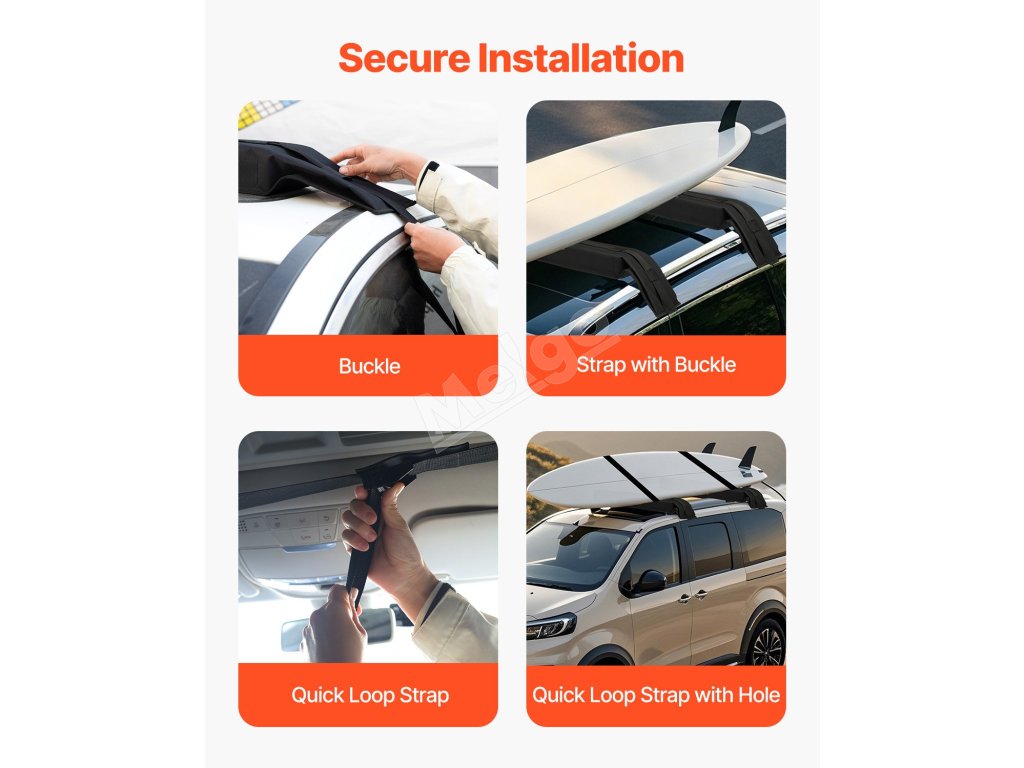Inštalácia je jednoduchá vďaka nastaviteľným popruhom a prackám, ktoré rýchlo upevnia mäkké podložky na strechu vášho vozidla. V priebehu niekoľkých minút môžete mať strešný nosič pripravený, vďaka čomu bude vaša príprava na cestovanie rýchla a efektívna.