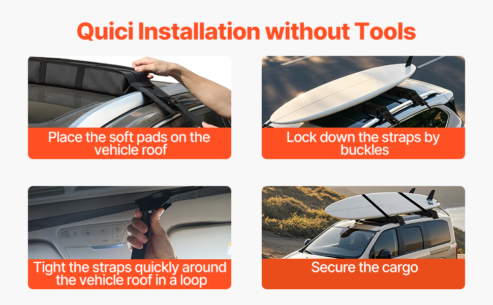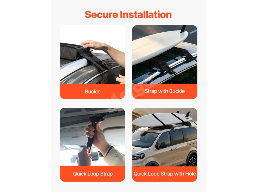 Inštalácia je jednoduchá vďaka nastaviteľným popruhom a prackám, ktoré rýchlo upevnia mäkké podložky na strechu vášho vozidla. V priebehu niekoľkých minút môžete mať strešný nosič pripravený, vďaka čomu bude vaša príprava na cestovanie rýchla a efektívna.