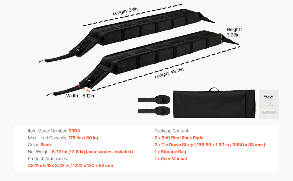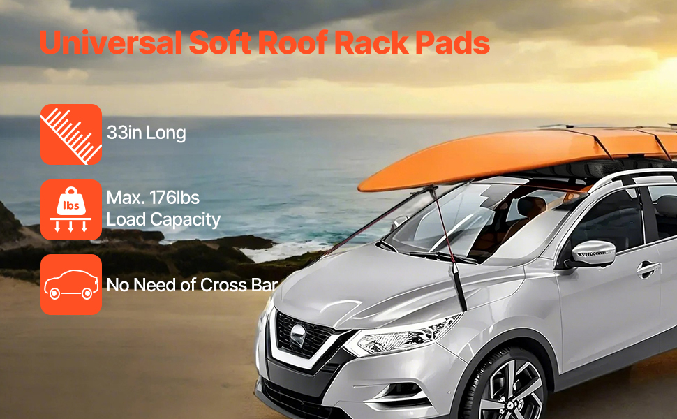 Naše 33-palcové mäkké podložky pod strešný nosič sú kompatibilné s väčšinou vozidiel s bočnými lištami alebo bez nich a poskytujú nosnosť až 176 kg. Tieto podložky pod strešné nosiče kajakov sú vyrobené z mäkkých, ale odolných materiálov a zabezpečujú bezpečné a spoľahlivé riešenie na prepravu kajakov, kanoe, SUP, snowboardov atď.
