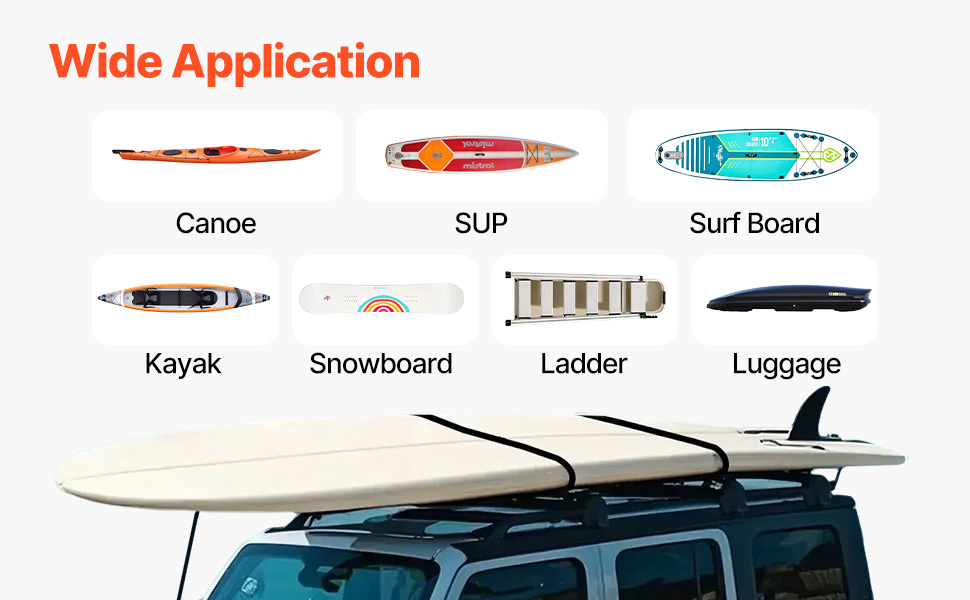 Vytvorte si na streche dodatočný úložný priestor a bezpečne prepravujte kajaky, surfy, dlhé dosky, pádla, lyže, kanoe a ďalší outdoorový výstroj pomocou robustných popruhov na suchý zips a viazacích popruhov, ktoré sú ideálne na všetky vaše dobrodružstvá.