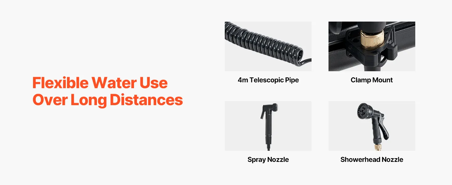 Táto nádrž na vodu spája dve striekacie hlavice so 4 m predlžovacou hadicou vyrobenou z odolného PE materiálu na dlhodobé používanie. Umožňuje čistenie na veľkú vzdialenosť a široký dosah bez nutnosti presúvať vozidlo, čo ponúka väčšiu flexibilitu a pohodlie.