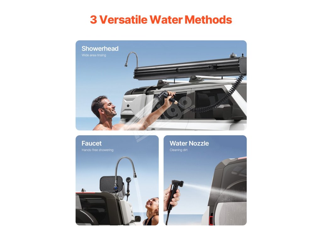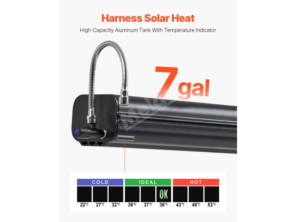 Táto strešná radová nádrž na vodu je vybavená ľahko čitateľnou nálepkou s teplotou a predĺžením kohútika. Výsledkom je, že táto zostava umožňuje vonkajšie sprchovanie bez použitia rúk, vďaka čomu je pohodlnejšia na vonkajšie použitie.