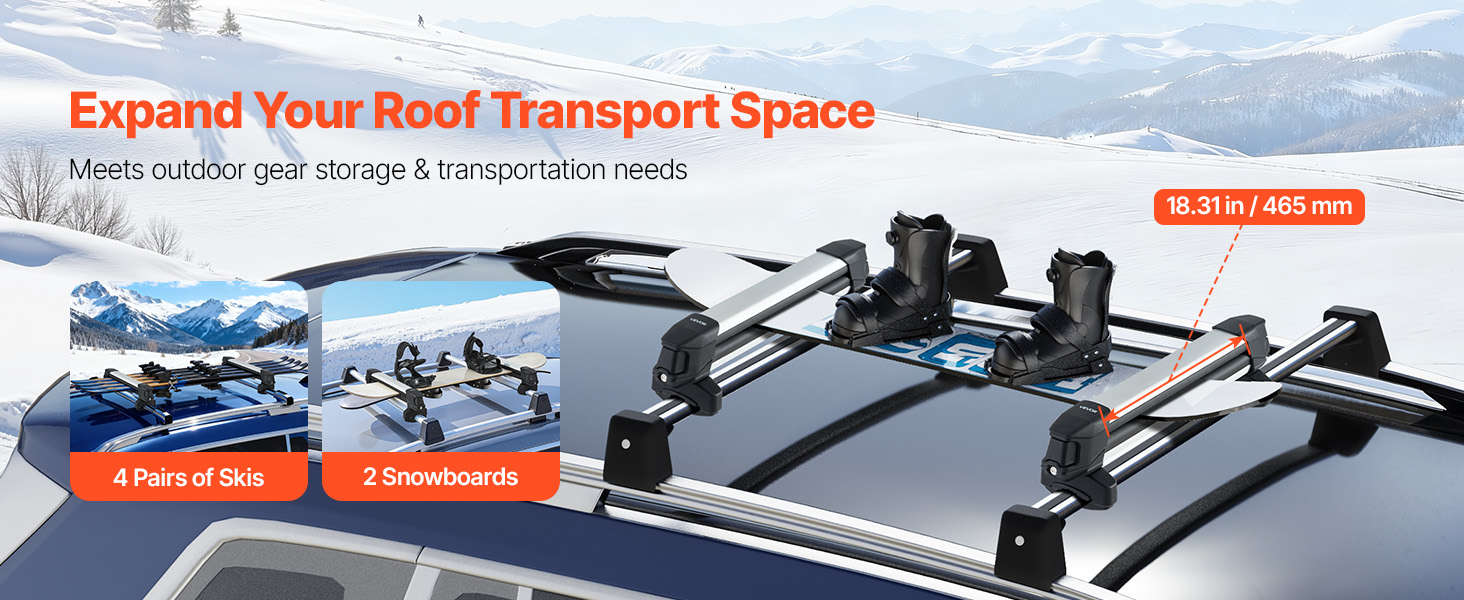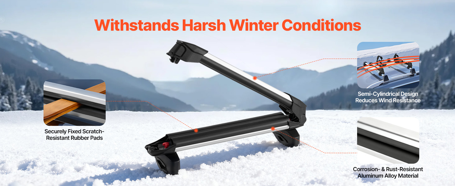Náš strešný nosič lyží a snowboardov obsahuje zámok proti krádeži na bezpečnú a pohodlnú prepravu. Mäkké gumové podložky odolávajú poškriabaniu a udržujú lyže pevne na mieste. Polovičný valcový dizajn znižuje odpor vetra a hluk, zatiaľ čo odolný rám z hliníkovej zliatiny zaručuje trvalú spoľahlivosť.