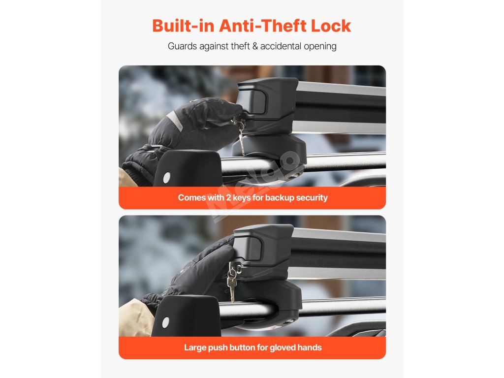 Náš nosič lyží je vybavený zámkom proti krádeži, ktorý možno ľahko zaistiť alebo uvoľniť aj v rukaviciach. Táto premyslená konštrukcia vám umožňuje rýchlu a efektívnu obsluhu počas outdoorových výletov bez toho, aby ste si museli vyzliecť rukavice.