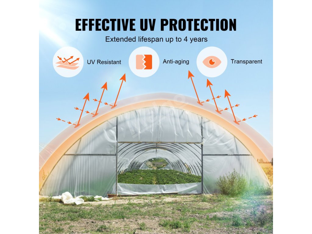Naša skleníková fólia je vyrobená z vysokokvalitného polyetylénového materiálu 6 MIL a ponúka dlhotrvajúcu odolnosť voči nepriaznivému počasiu. Vlastnosti odolné voči UV žiareniu chránia rastliny pred škodlivými lúčmi. Pohodlné balenie v rolke na jednoduchú manipuláciu a skladovanie.