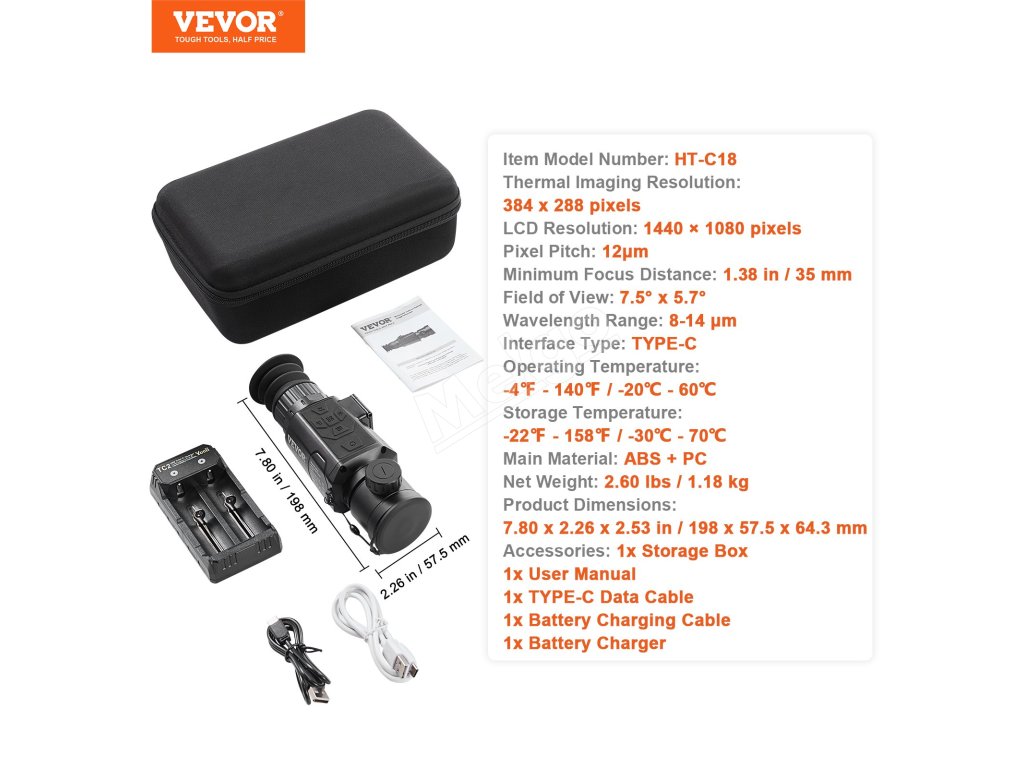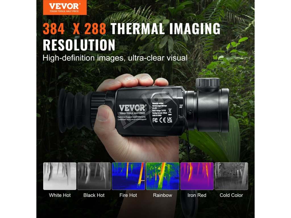 Monokulár VEVOR Thermal Imager: Vychutnajte si presnosť vo vysokom rozlíšení vďaka nášmu termovíznemu rozlíšeniu 384 × 288. Ponúka 6 farebných paliet: bielo-horúci, čierno-horúci, ohnivo-horúci, dúhový, železno-červený a studený farebný režim. Pripravte sa na novú úroveň vizuálnej čistoty a odhaľte skryté problémy!