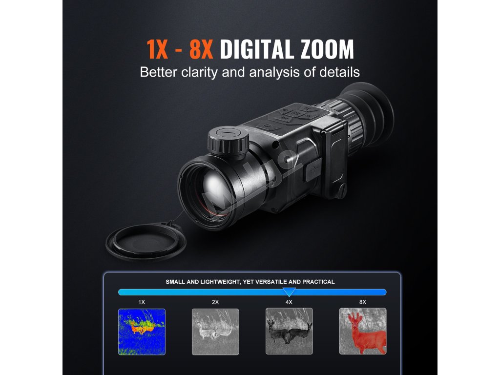 Vďaka 1X, 2x, 4x, 8X digitálnemu priblíženiu táto termovízna kamera plynulo zväčšuje obrazovku, čím zabezpečuje kvalitný zážitok pri pozorovaní pohyblivých cieľov bez oneskorenia. Podporuje sledovanie hotspotov, snímanie obrazu, nahrávanie videa, formáty súborov JPG a MP4, čím zvyšuje pohodlie pri používaní.