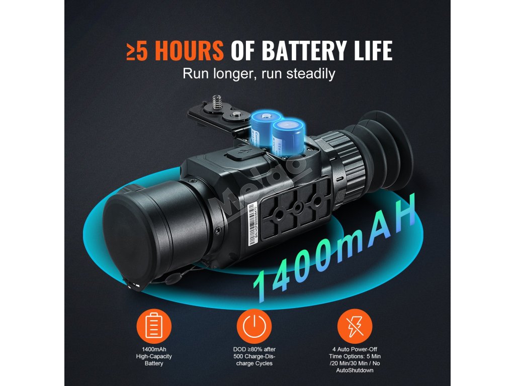 Táto termokamera je napájaná vysokokapacitnou batériou s kapacitou 1400 mAh a na jedno nabitie ponúka viac ako 5 hodín nepretržitého používania. Po 500 cykloch nabíjania a vybíjania zostáva DOD batérie ≥ 80 %. Ponúka tiež 4 možnosti automatického vypnutia: 5 min, 20 min, 30 min alebo bez automatického vypnutia.