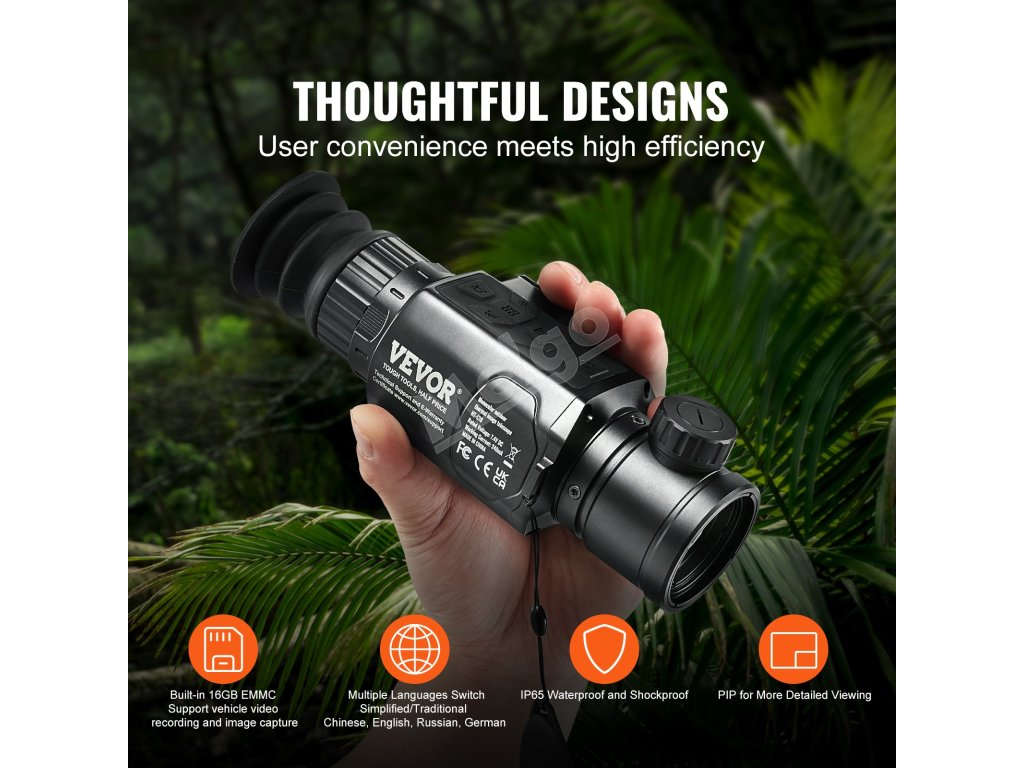 Vstavaná 16GB pamäť EMMC podporuje nahrávanie videa a snímanie obrázkov v aute a ponúka prepínanie viacerých jazykov. Funkcia vodotesnosti IP54 odolá nepriaznivým podmienkam. Funkcia PIP umožňuje jemnejšiu kontrolu detailov cieľa, čo je vhodné pre dobrodružstvá v prírode, pozorovanie divokej zveri, chov hospodárskych zvierat a iné.