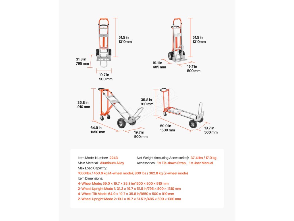 Prepravný vozík 4 v 1, nosnosť 453.6 kg, hliník, protišmyková rukoväť