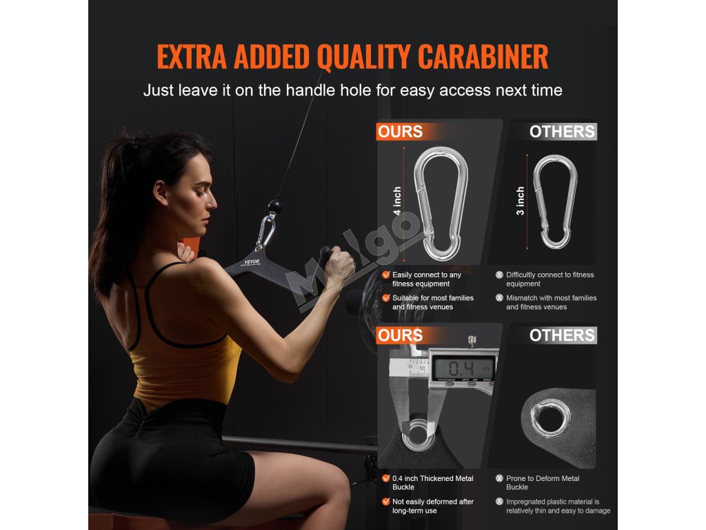 Priložená karabína je o 4 palce dlhšia, čo uľahčuje jednoduché pripevnenie k akémukoľvek fitnes zariadeniu. Vhodné pre väčšinu domácností a posilňovní.