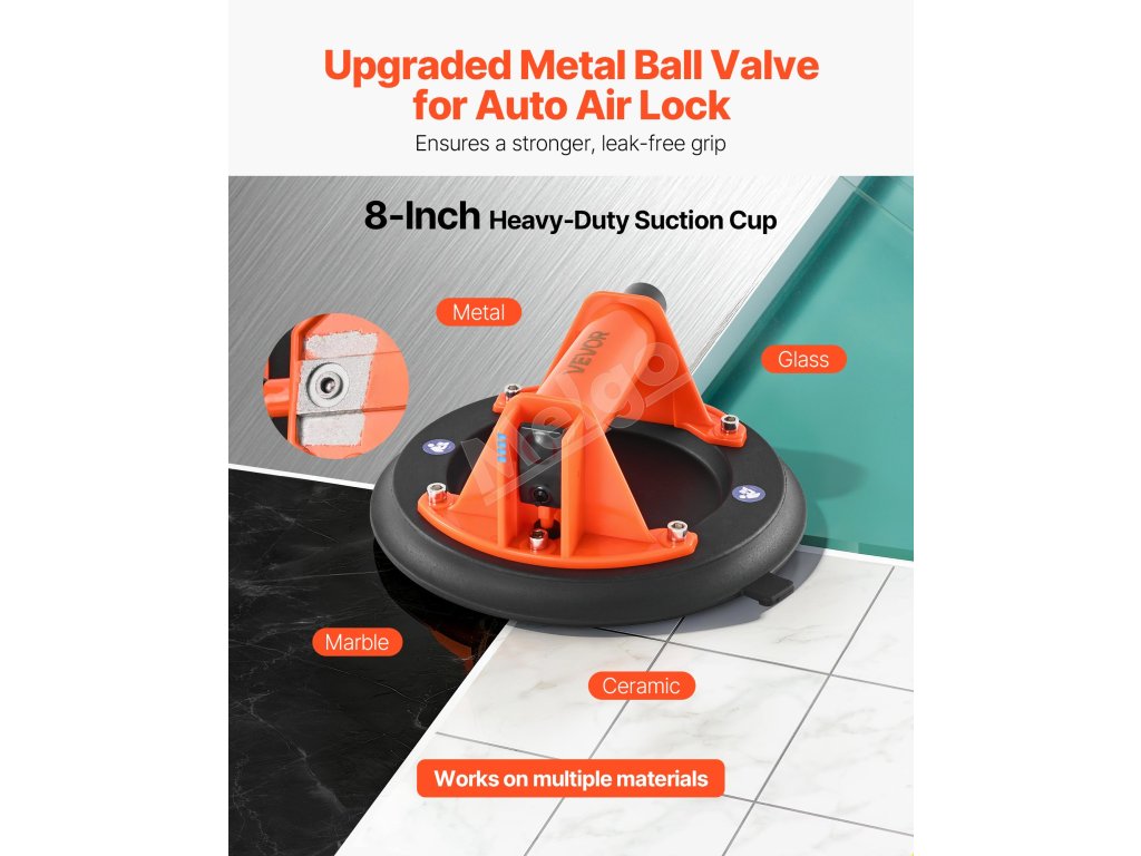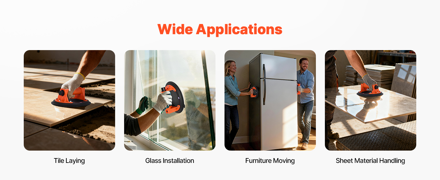 Vákuový zdvihák vyniká pri pokladaní veľkých dlaždíc, manipulácii so sklom, inštalácii dverí a okien a pri presúvaní. Nástroj je vhodný ako pre renováciu domov, tak aj pre priemyselnú prácu.