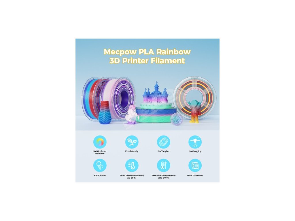 Dúhový filament Mecpow PLA Rainbow prináša jedinečné efekty zmeny farieb, čím odomyká neobmedzený kreatívny potenciál vašich projektov. Vytvára žiarivé dúhové gradienty, čím zvyšuje realizmus a vizuálnu príťažlivosť vašich 3D tlačených diel. S vláknom PLA Rainbow môžete bez námahy dosiahnuť dynamické farebné prechody a premeniť svoje projekty na pôsobivé, realistické výtvory.