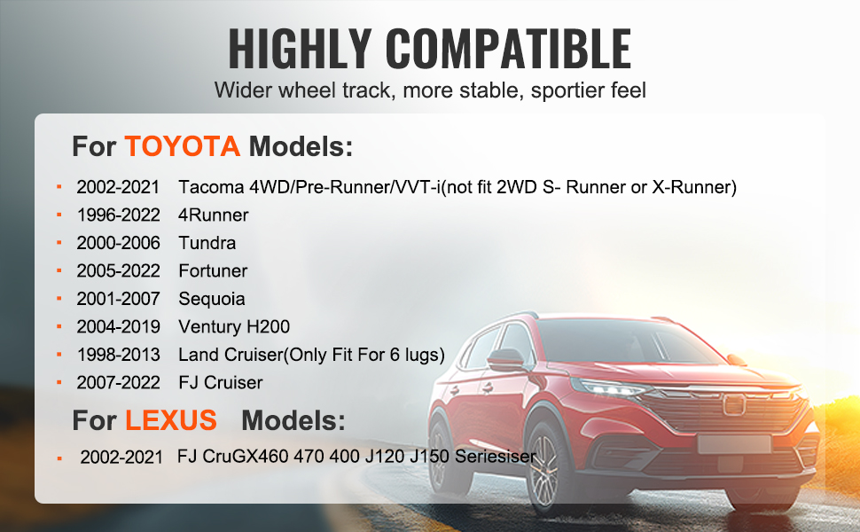 Tieto adaptéry kolies sa používajú na rozšírenie rozchodu kolies, čím sa zvyšuje stabilita vozidla a poskytuje sa viac priestoru vo vnútri kolesa pre nové zavesenie, brzdy a ďalšie príslušenstvo. Dodávajú vozidlu dynamickejší a agresívnejší vzhľad.
