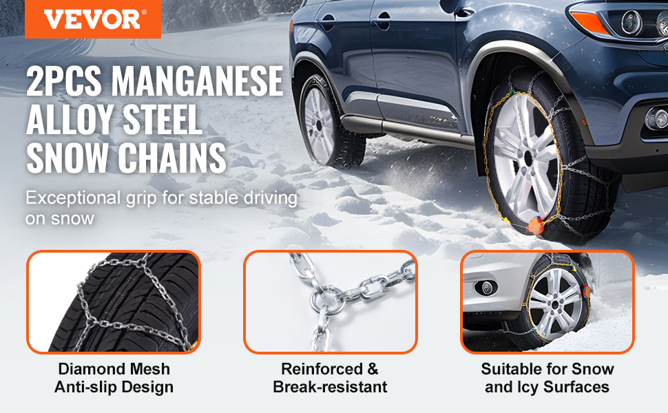 Tieto káblové reťaze na pneumatiky sú vyrobené z vysokopevnostnej mangánovej legovanej ocele a sú veľmi odolné, odolávajú opotrebovaniu a poškodeniu pri dlhodobom používaní na snehu.