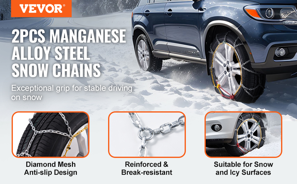 Tieto káblové reťaze na pneumatiky sú vyrobené z vysokopevnostnej mangánovej legovanej ocele a sú veľmi odolné, odolávajú opotrebovaniu a poškodeniu pri dlhodobom používaní na snehu.