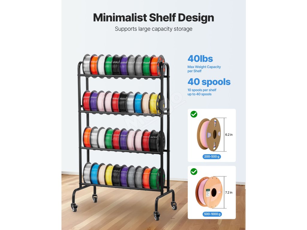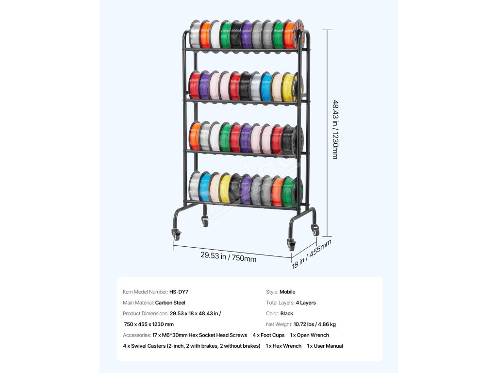 Tento regál na ukladanie filamentu, ktorý je vybavený 4-vrstvovými jednoradovými policami, pojme až 10 cievok na jednu vrstvu! Je ideálny na prehľadné uloženie nástrojov a cievok, čím sa vytvorí uprataný pracovný priestor, ktorý zefektívni a spríjemní vašu prácu!