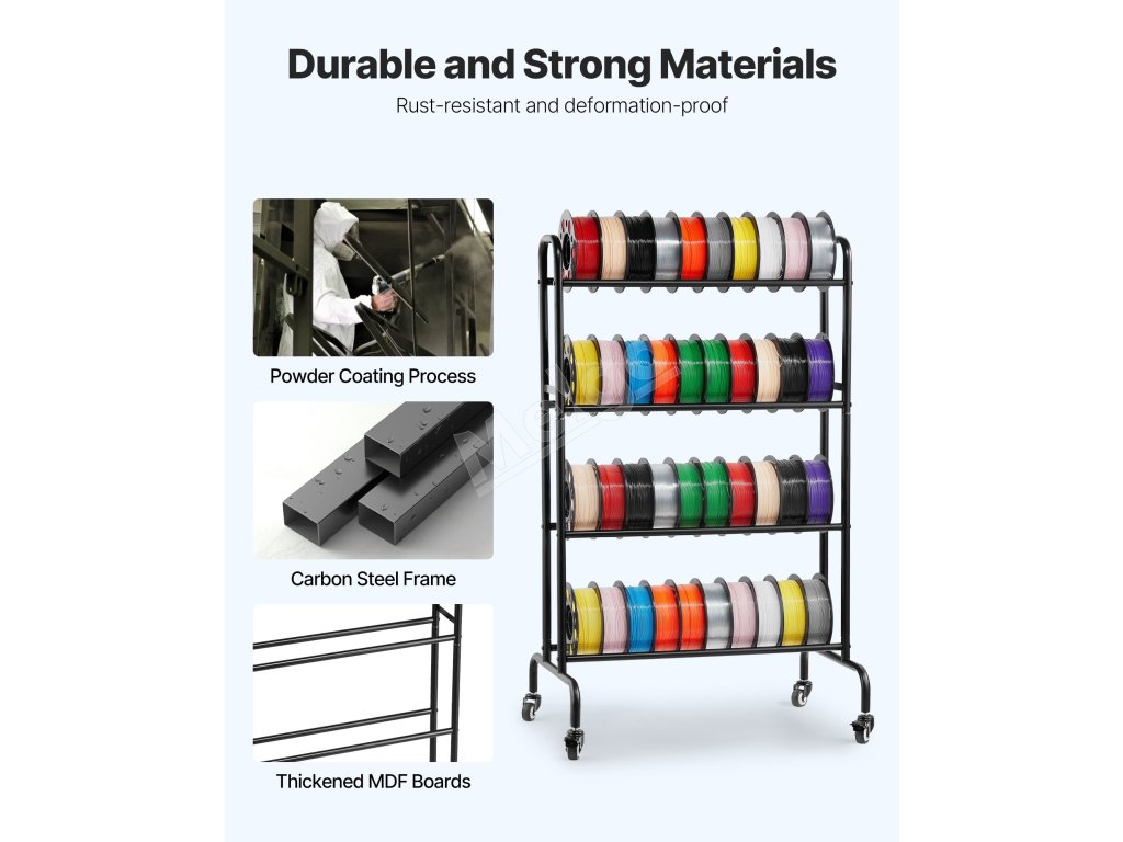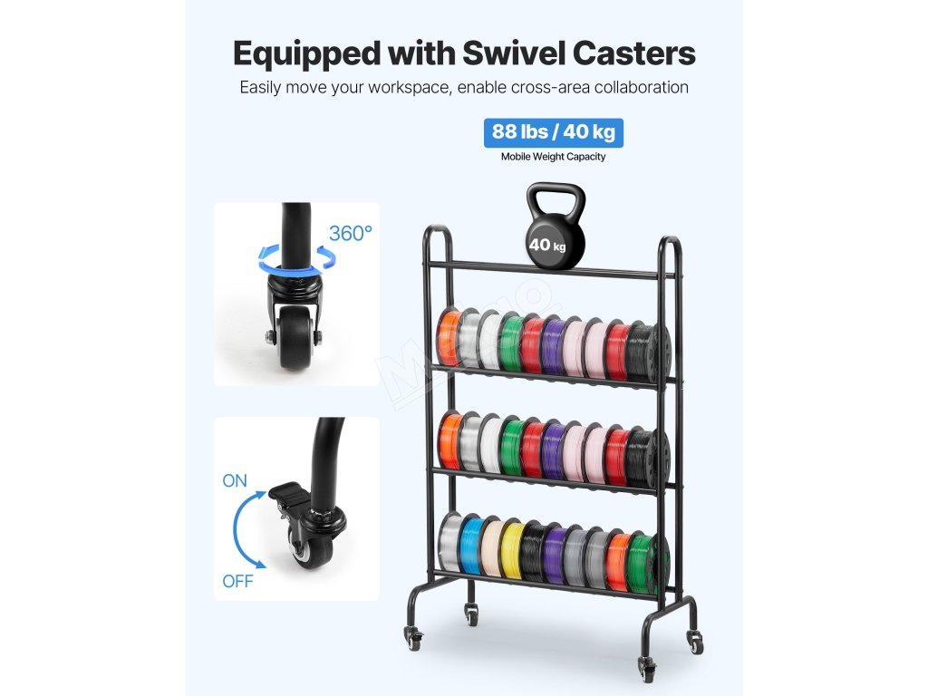 Tento regál na filamenty je vybavený 360° otočnými kolieskami s brzdovým systémom, ktoré umožňujú jednoduchý pohyb a bezpečné umiestnenie. Jeho robustný rám z uhlíkovej ocele a doska MDF unesú až 88 libier / 40 kg, takže prístup k vašim predmetom je bezproblémový a pohodlný!