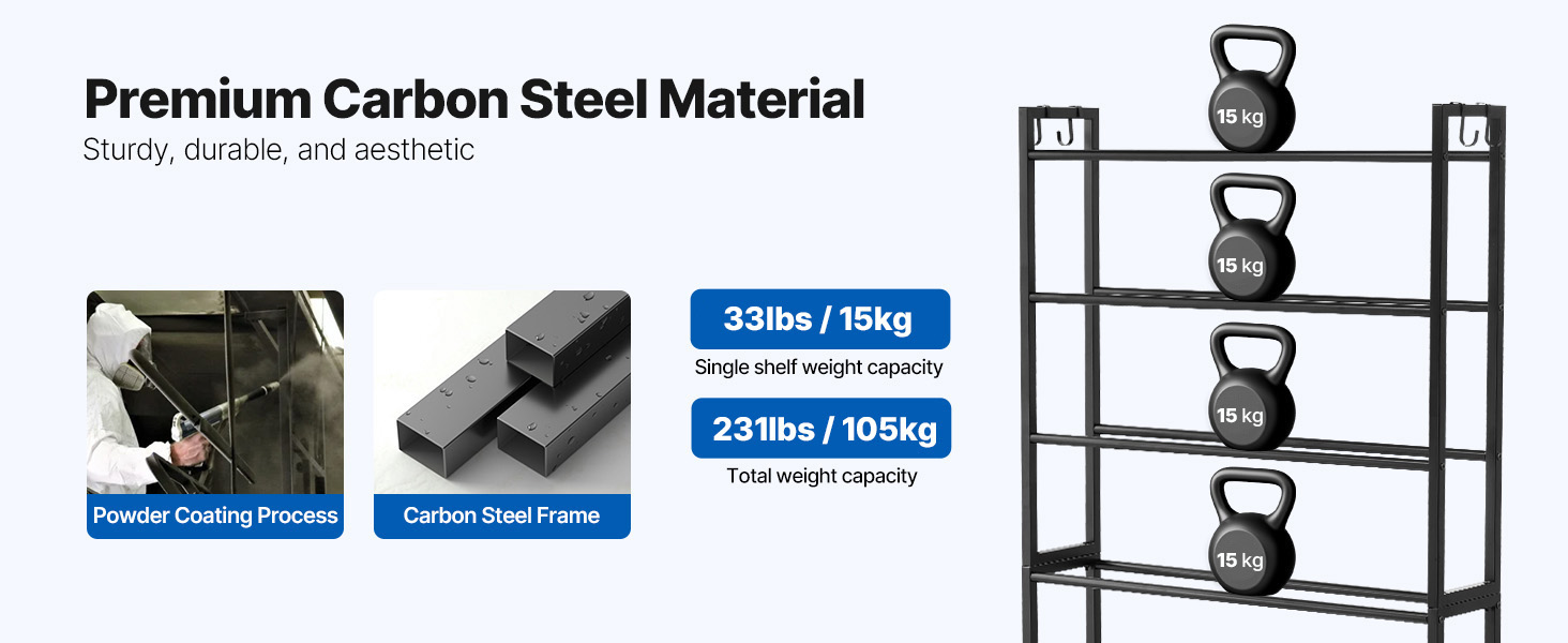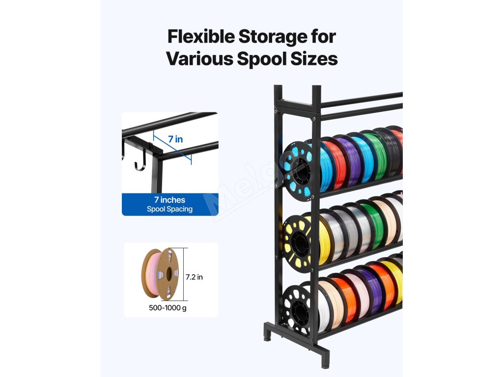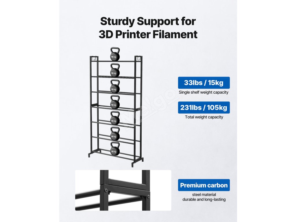 Tento stojan na ukladanie filamentov je vyrobený z uhlíkovej ocele s jemnou práškovou povrchovou úpravou a vyznačuje sa bezpečnostným dizajnom s hladkými hranami. Je pevný, odolný a skonštruovaný tak, aby vydržal dlhodobé používanie.