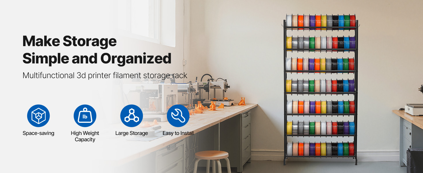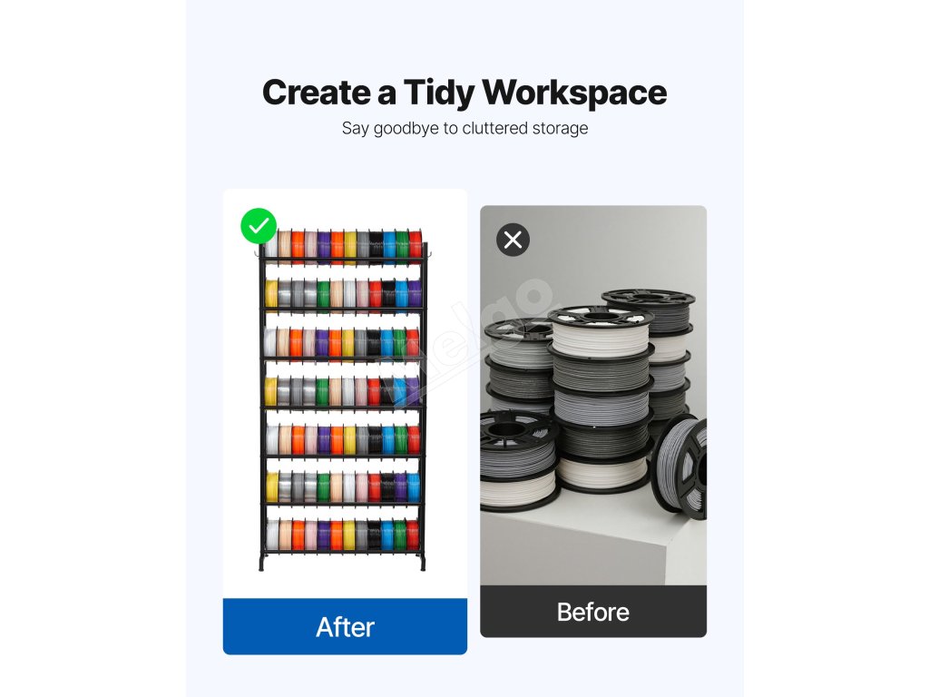 Ideálny pre akýkoľvek priestor! Či už ide o dielňu, kanceláriu alebo tlačiareň, tento držiak na cievky filamentov sa prispôsobí každému prostrediu. Je univerzálny, ľahko a prakticky spĺňa potreby skladovania v rôznych prostrediach.
