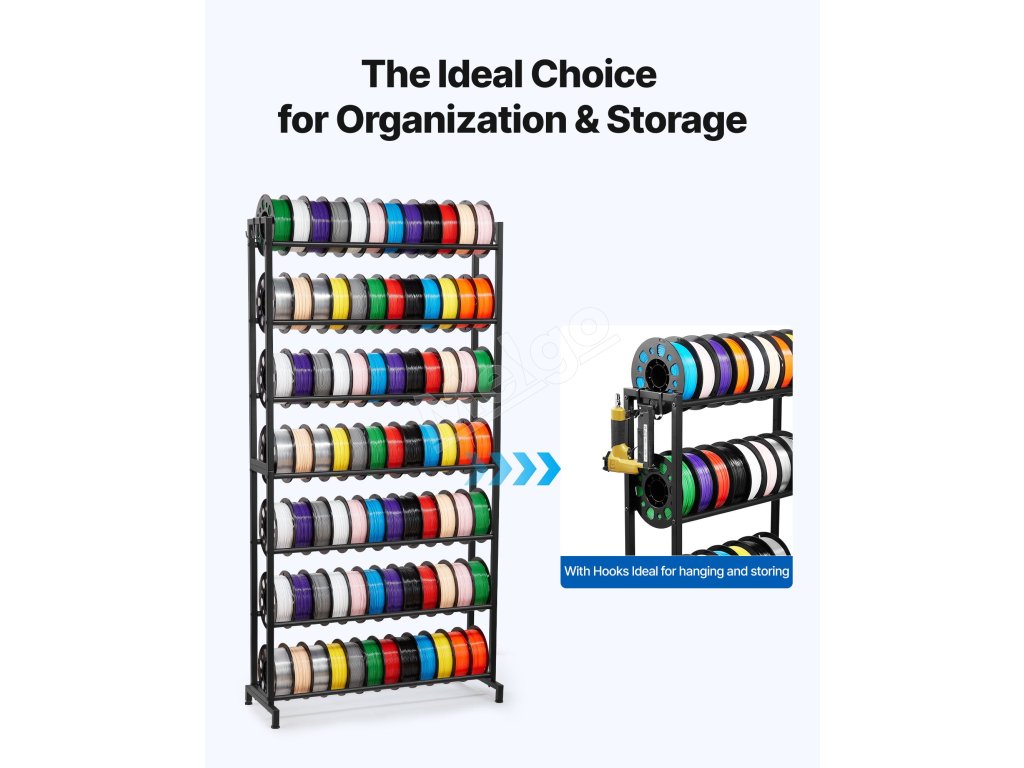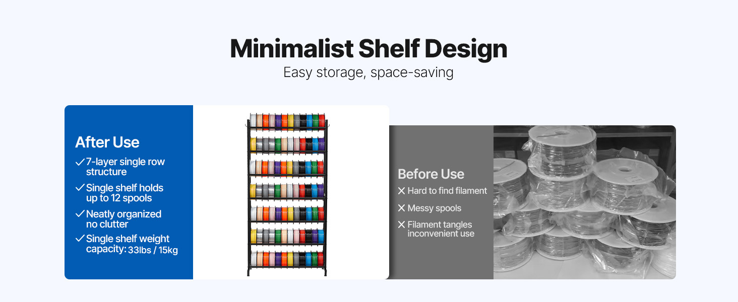 Vďaka elegantnému dizajnu v tvare písmena H a 7-stupňovým jednoradovým policiam tento stojan na 3D vlákna maximalizuje úložný priestor a zároveň udržiava prehľadnosť a atraktívnosť. Je to skvelá rovnováha efektívnosti a štýlu pre akýkoľvek priestor.