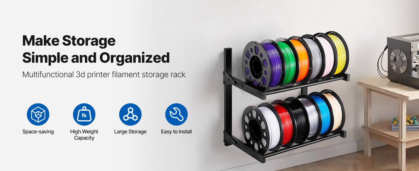 Ideálne pre akýkoľvek priestor! Či už ide o dielňu, kanceláriu alebo tlačiareň, tento držiak na cievky filamentov sa prispôsobí každému prostrediu. Je univerzálny, ľahko a prakticky spĺňa potreby skladovania v rôznych prostrediach.