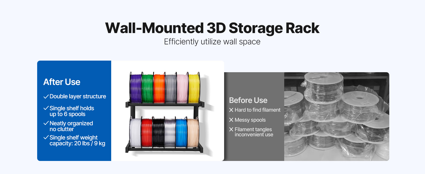 Maximalizujte priestor na stene pomocou tohto nástenného stojana na 3D vlákna! Dvojvrstvová štruktúra udržiava položky usporiadané, čím uľahčuje ukladanie a prístup k vašim potrebám.