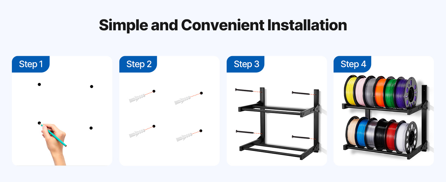 Tento stojan na ukladanie filamentov je vyrobený z uhlíkovej ocele s jemnou práškovou povrchovou úpravou a vyznačuje sa bezpečnostným dizajnom s hladkými hranami. Je pevný, odolný a skonštruovaný tak, aby vydržal dlhodobé používanie.