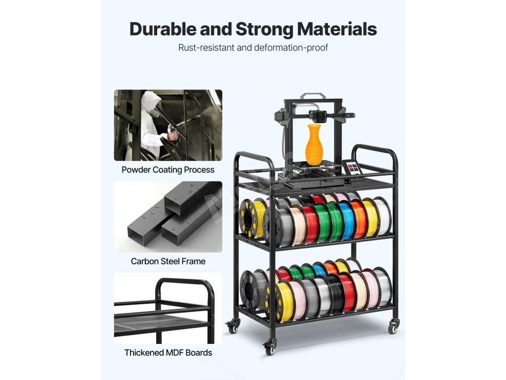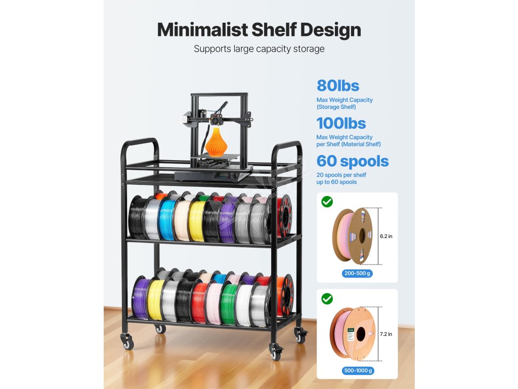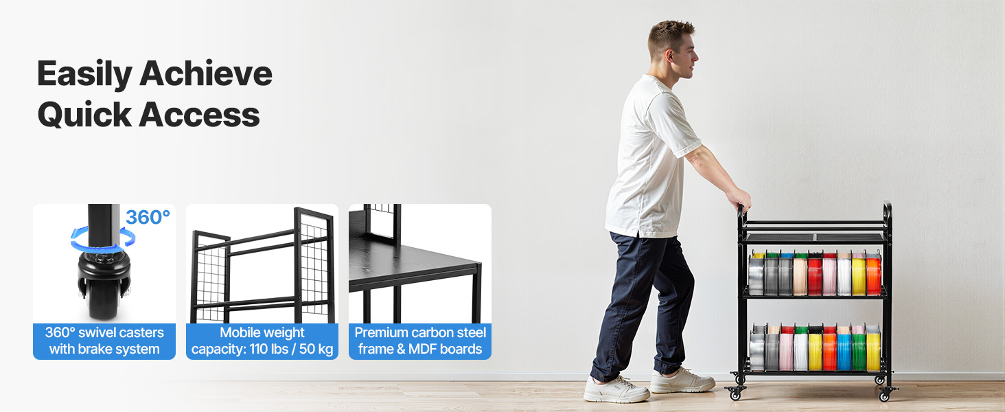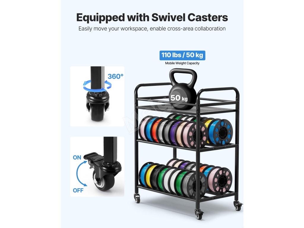 Tento regál na filamenty je vybavený 360° otočnými kolieskami s brzdovým systémom, ktoré umožňujú jednoduchý pohyb a bezpečné umiestnenie. Jeho robustný rám z uhlíkovej ocele a doska MDF unesú až 110 libier / 50 kg, vďaka čomu je prístup k vašim predmetom bezproblémový a pohodlný!